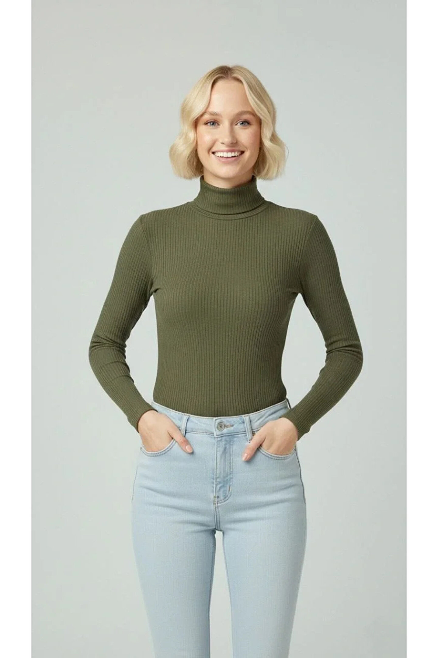 Kadın Tam Boğazlı Fitilli Likrali Kaşkorse Badi İnce Uzun Kollu Rahat Kazak - Haki