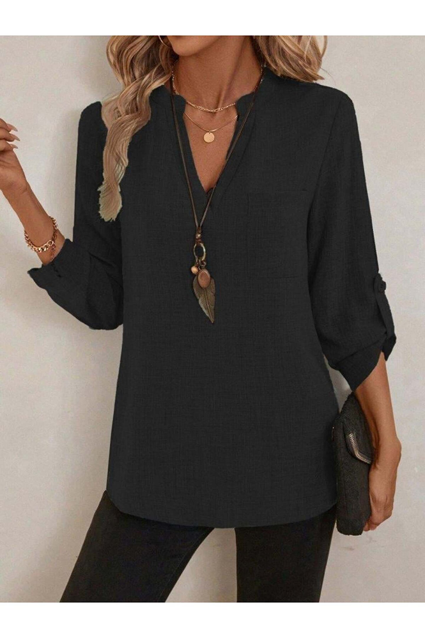 Kadın Truvakar Kol V Yakalı Keten Bluz