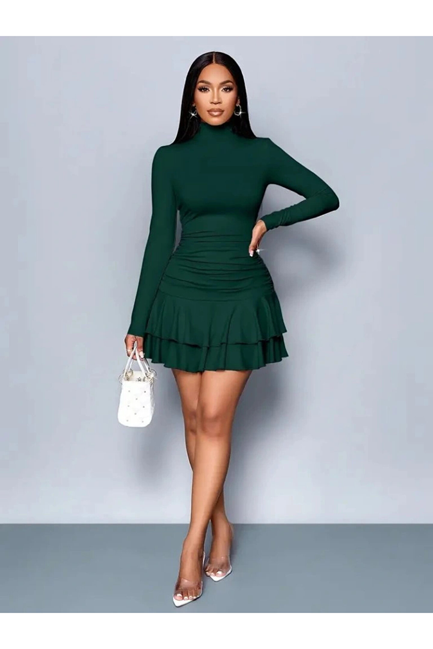 Kadın Uzun Kollu Balıkçı Yaka Mini Fırfırlı Sandy Elbise