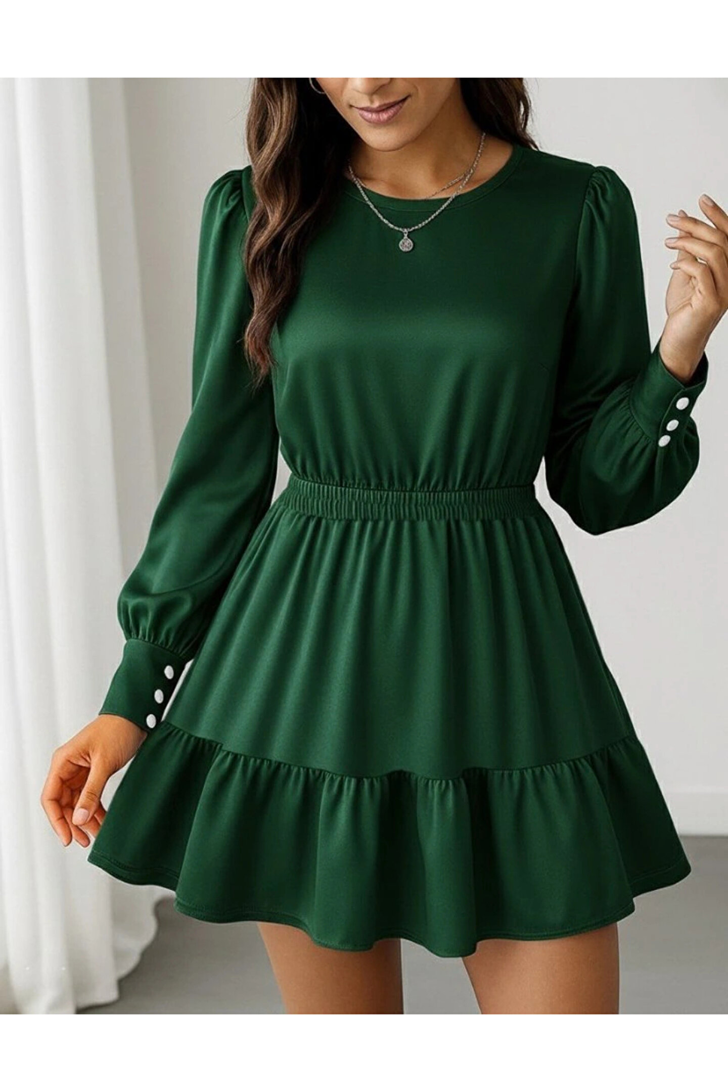 Silerra Kadın Uzun Kollu Bisiklet Yaka Beli Lastikli Fırfırlı Ithal Krep Elbise