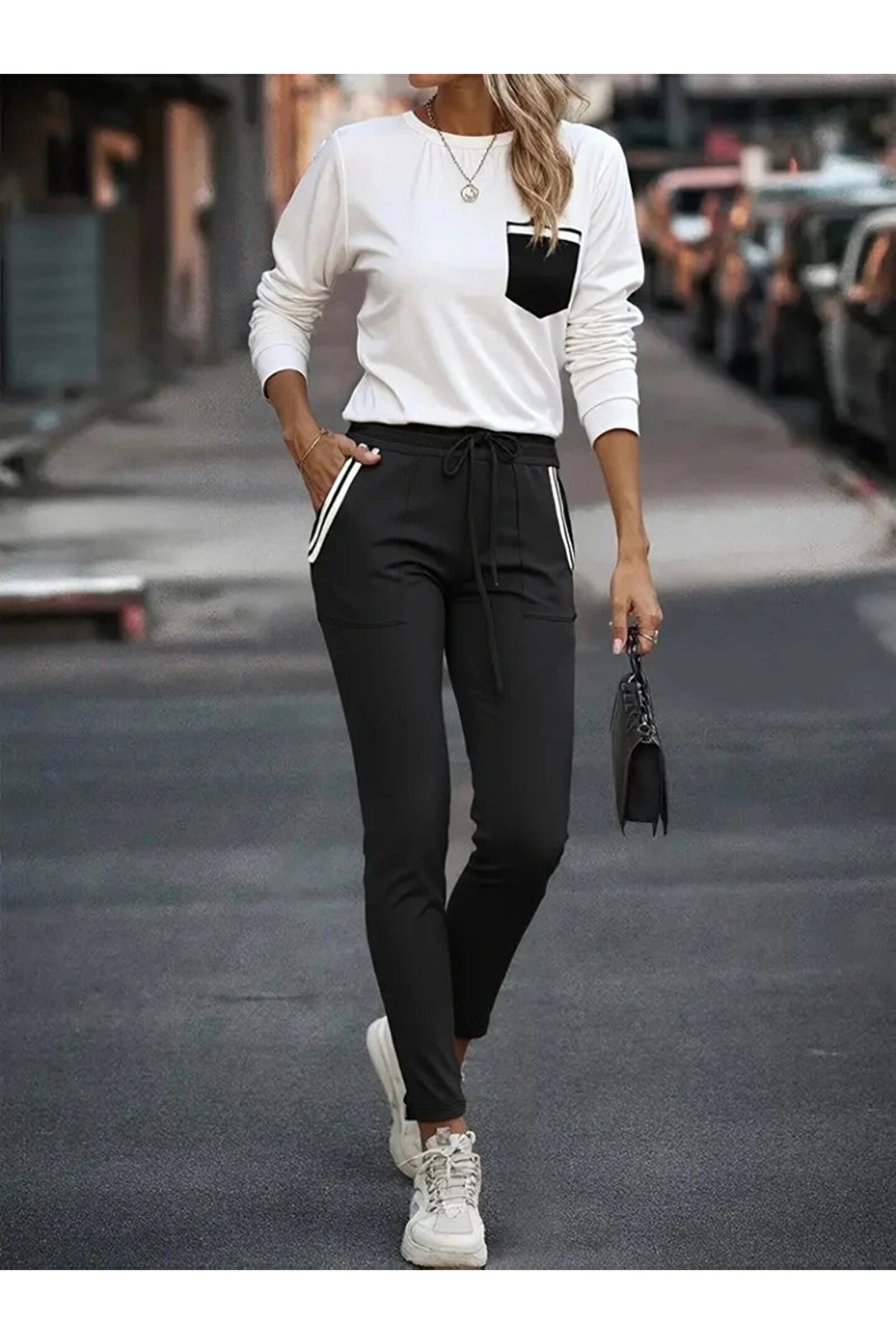Kadın Uzun Kollu Bisiklet Yaka Cepli Viskon Iki Iplik Bluz Ve Pantolon Ikili Takım
