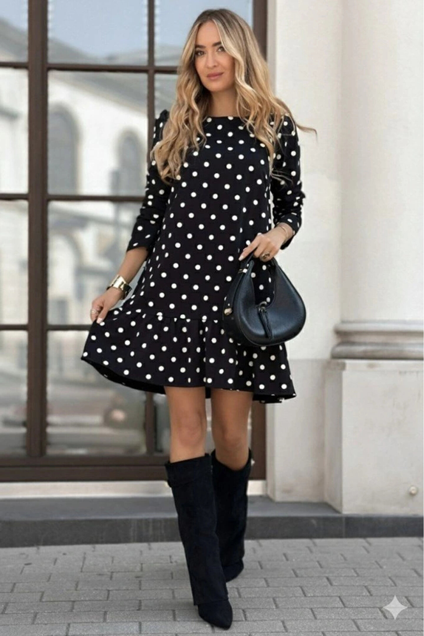 Kadın Uzun Kollu Bisiklet Yaka Fırfırlı Puantiyeli Kısa Modal Elbise