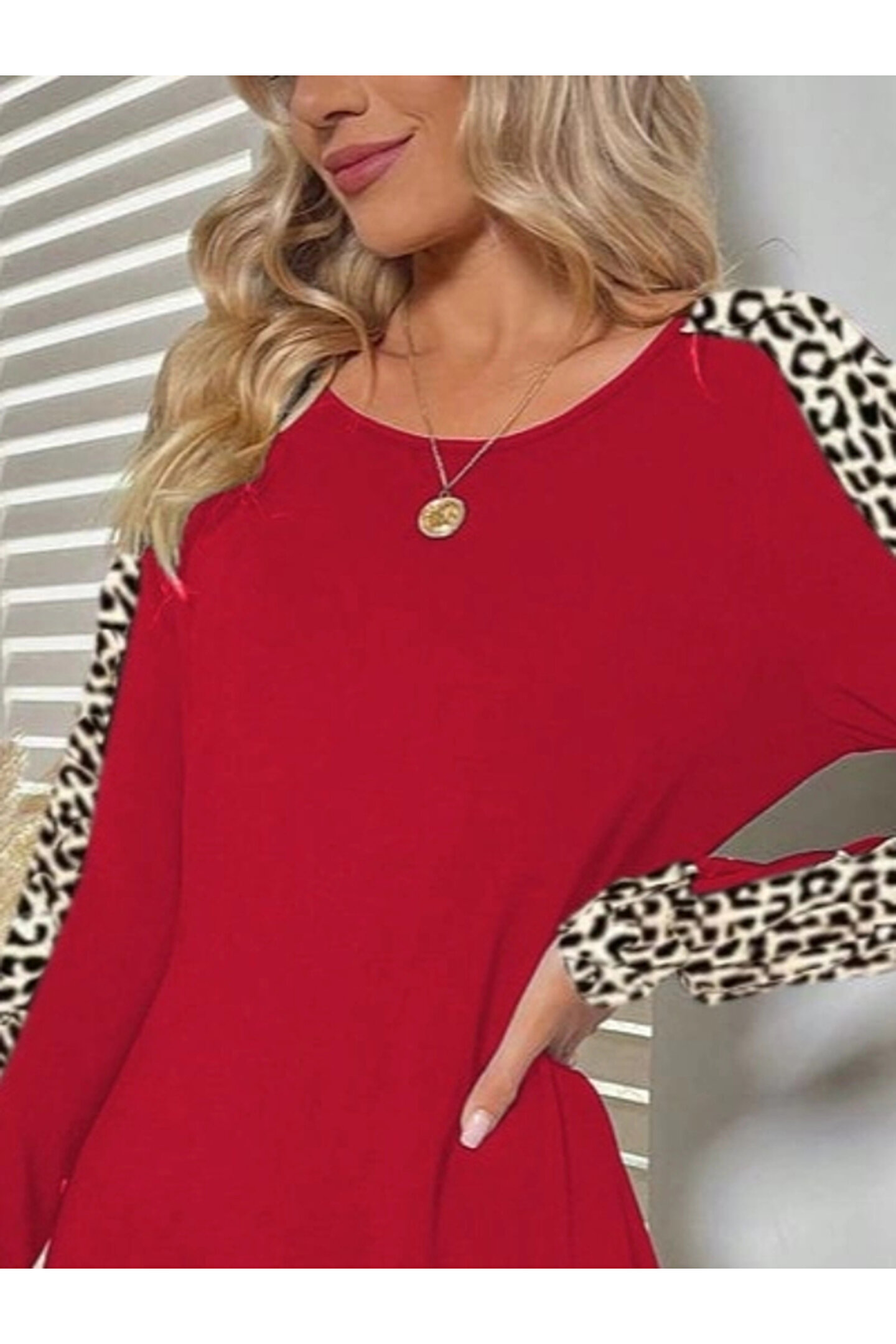 Kadın Uzun Kollu Bisiklet Yaka Kollar Leopar Detay Iki Iplik Mini Boy Elbise