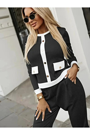 Kadın Uzun Kollu Bisiklet Yaka önden Düğmeli şardonlu Kaşkorse Bluz Ve Pantolon Ikili Takım