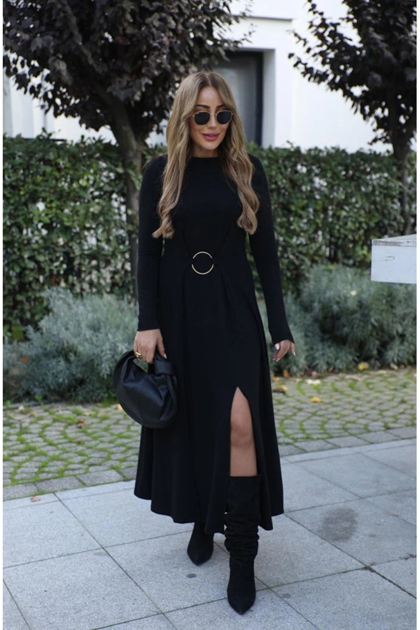 Kadın Uzun Kollu Bisiklet Yaka önden Halka Detaylı Yırtmaçlı Uzun Viskon Iki Iplik Elbise