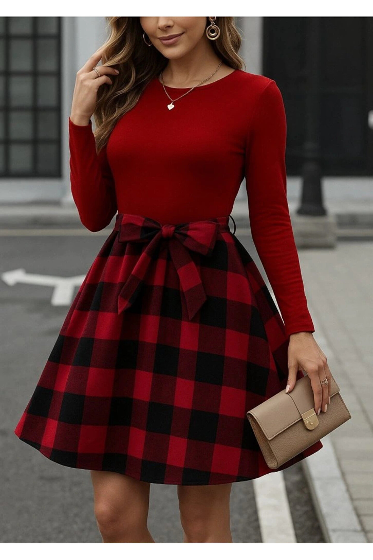 Kadın Uzun Kollu Bisiklet Yaka üst Viskon Alt Ekose Kısa Elbise