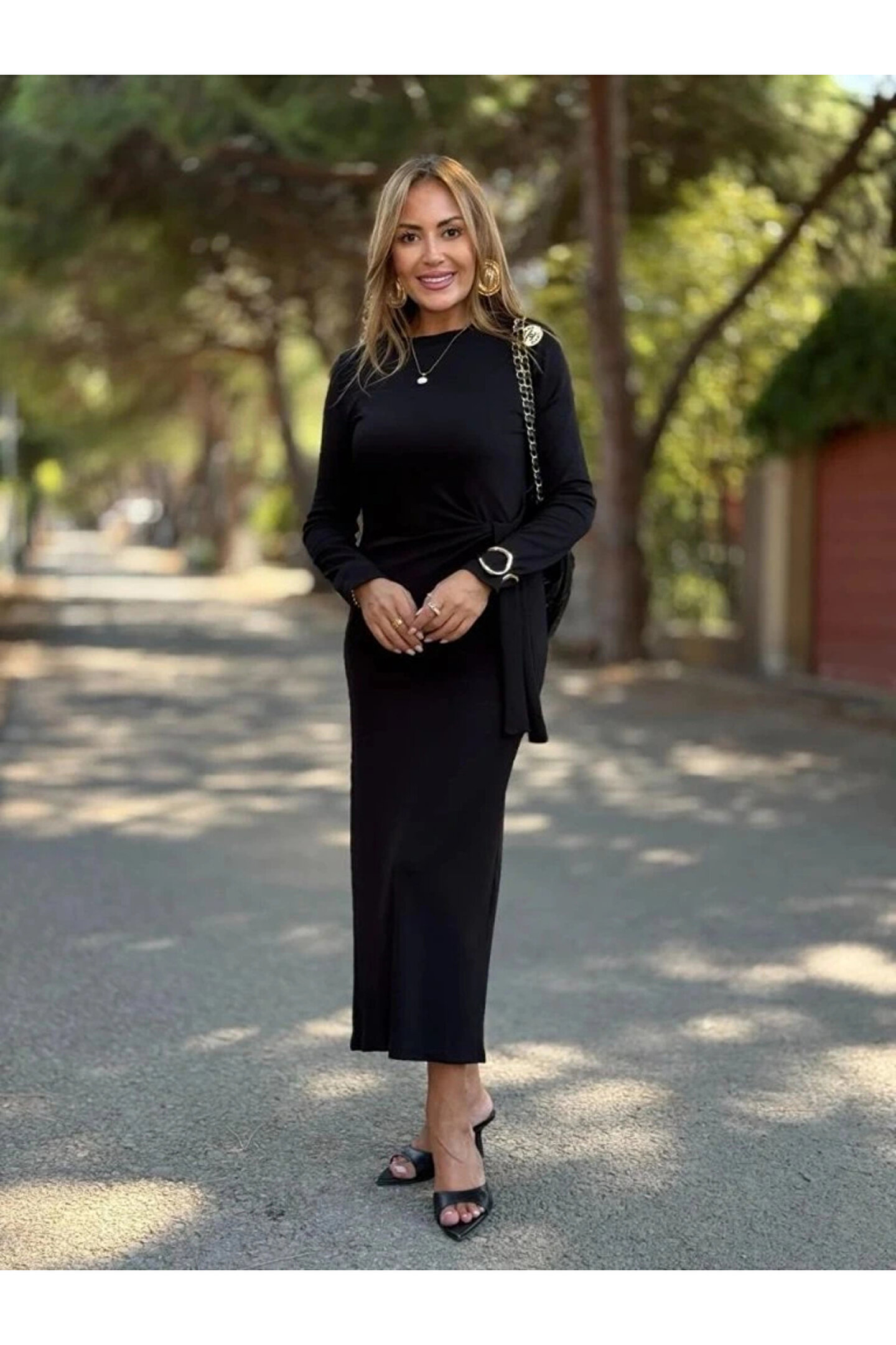Kadın Uzun Kollu Bisiklet Yaka Yandan Bağlamalı Uzun Modal Elbise