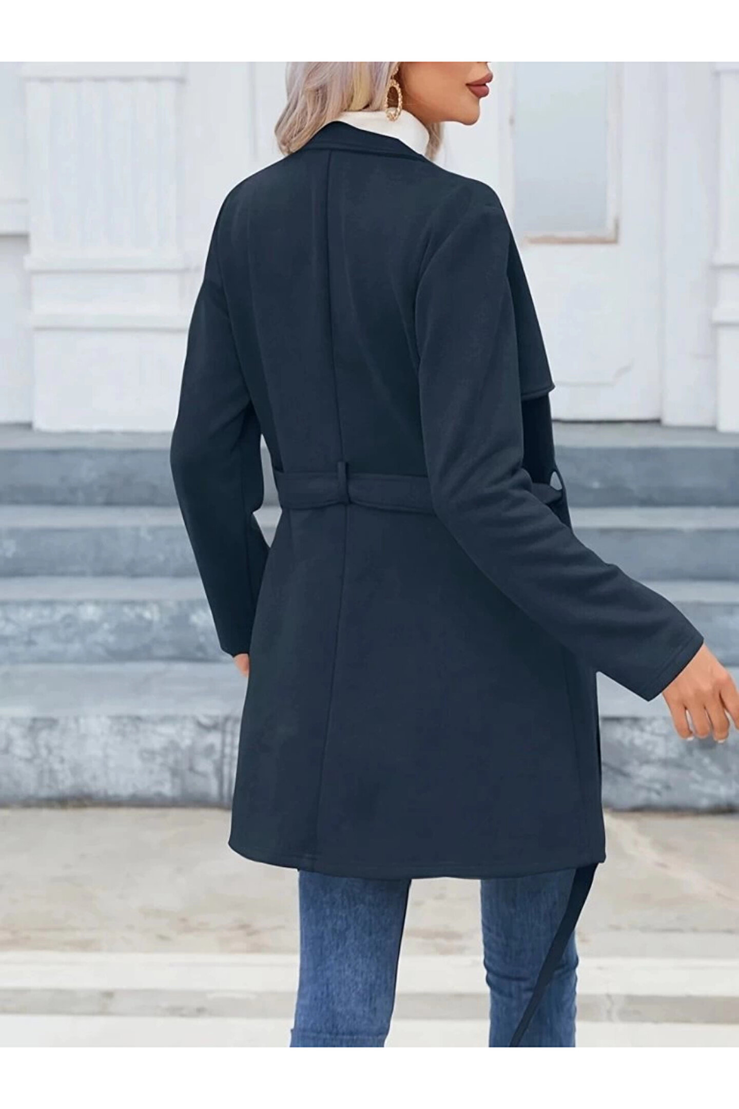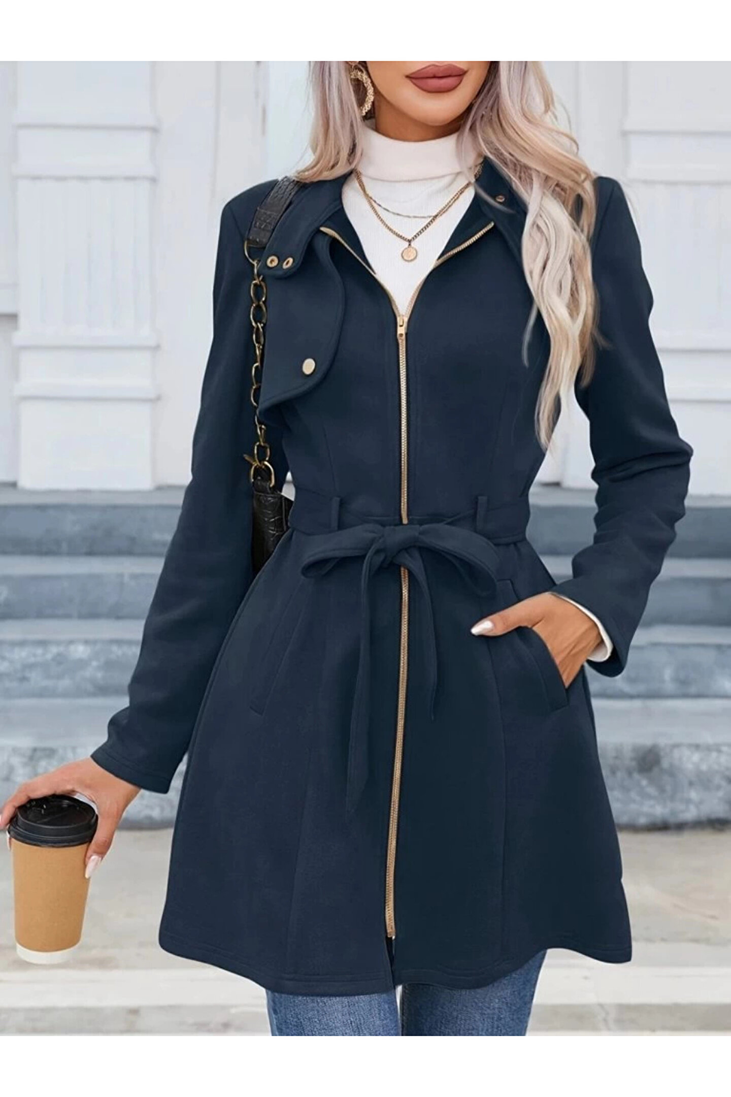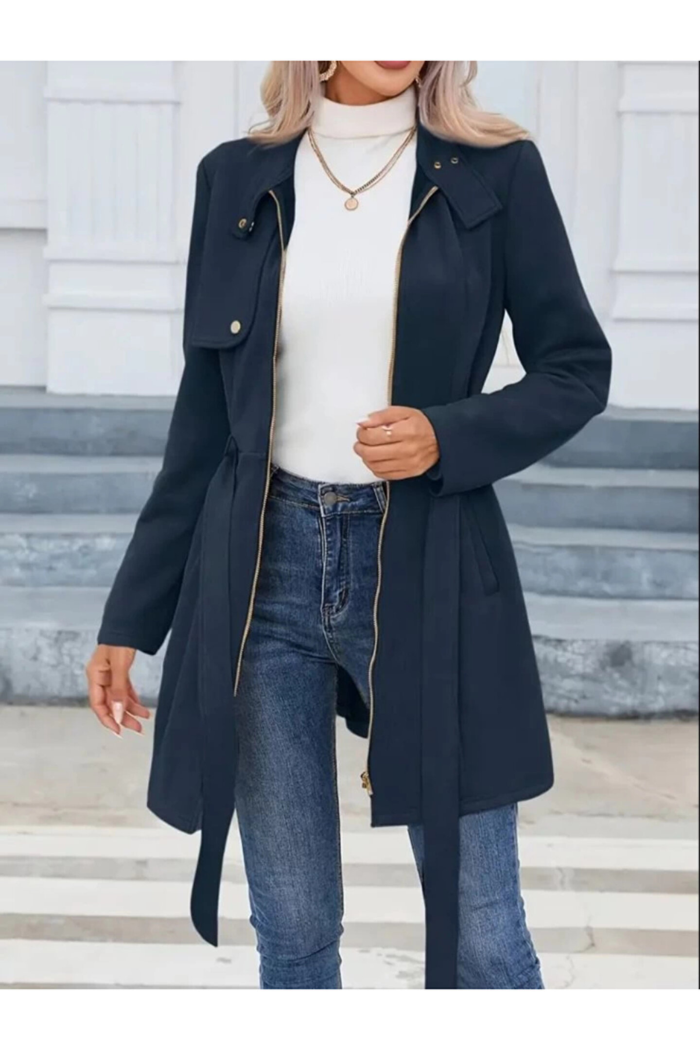 Kadın Uzun Kollu Boyundan Düğmeli Fermuarlı Beli Kuşaklı Süet Ceket