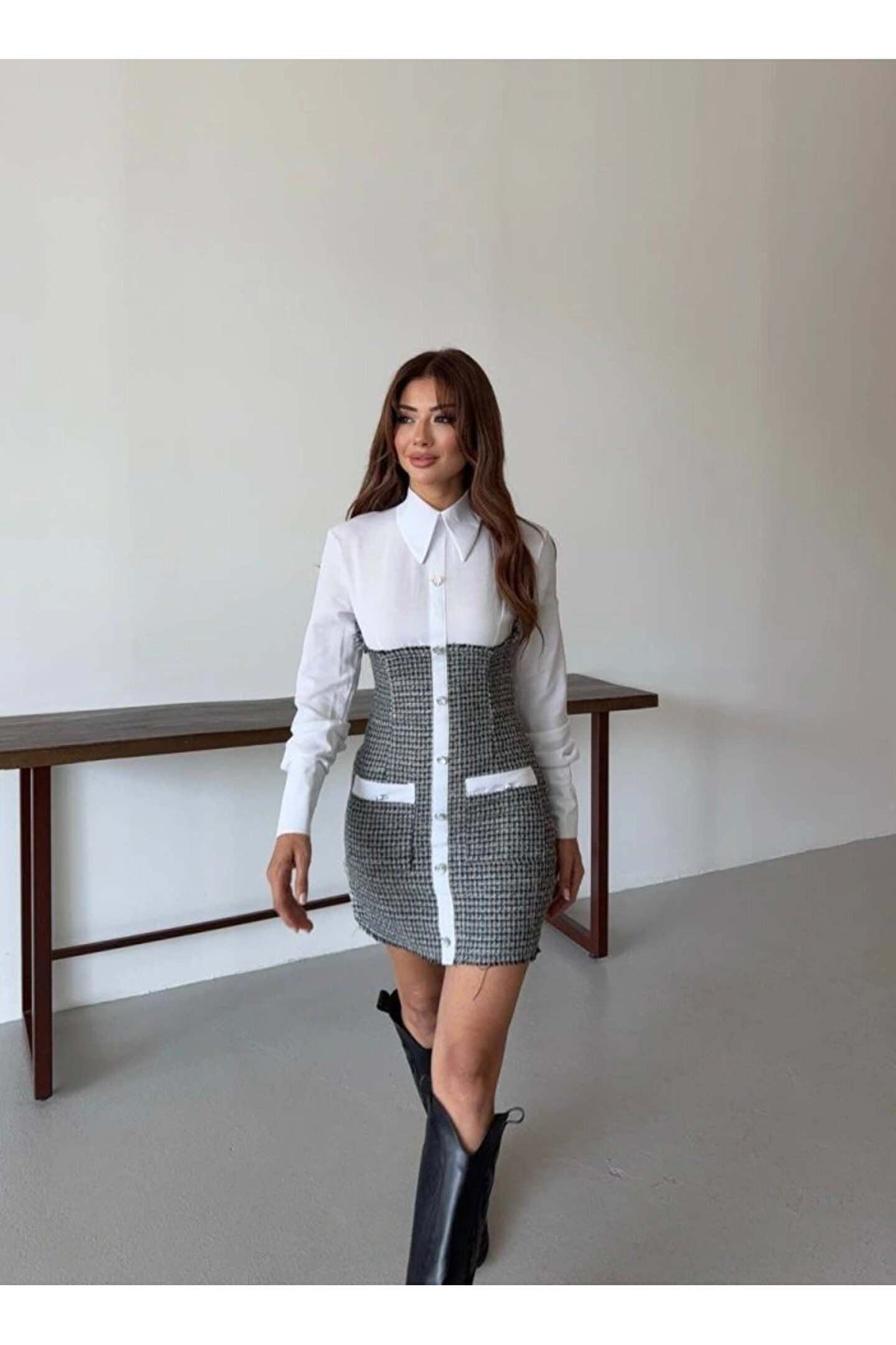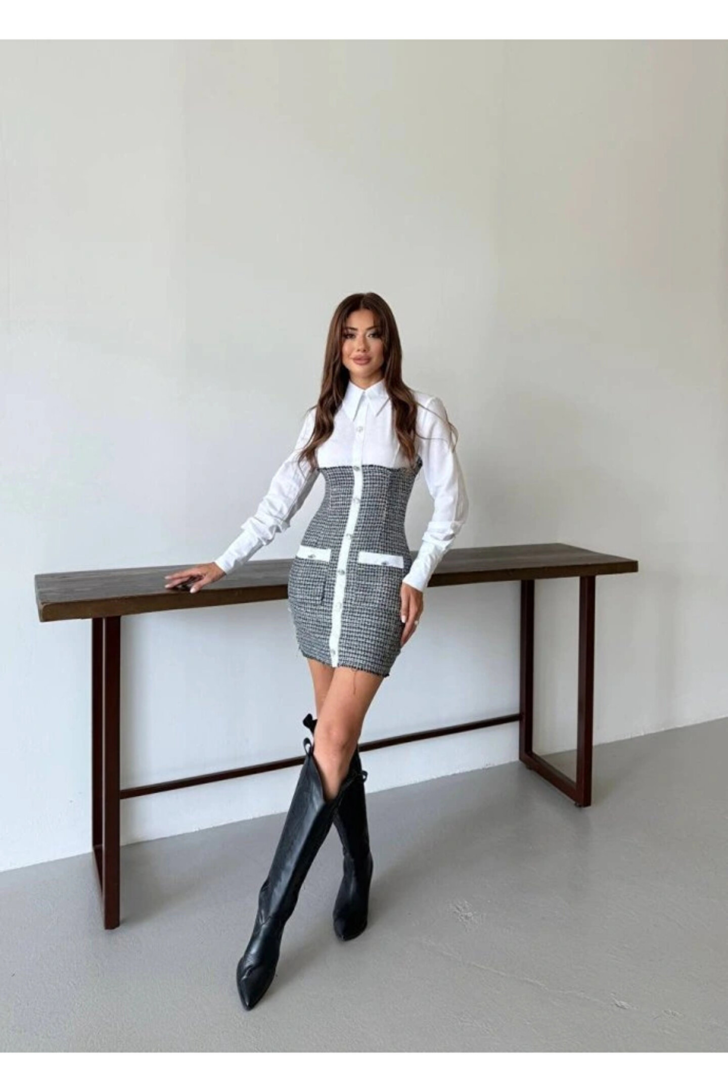 KADIN UZUN KOLLU CEP VE DÜĞME DETAY MİNİ GÖMLEK ELBİSE
