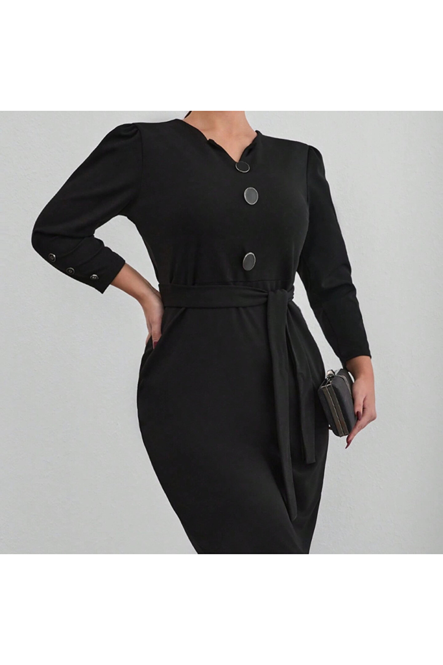 Kadın Uzun Kollu Düğme Detaylı Kendinden Kemerli Ithal Krep Elbise