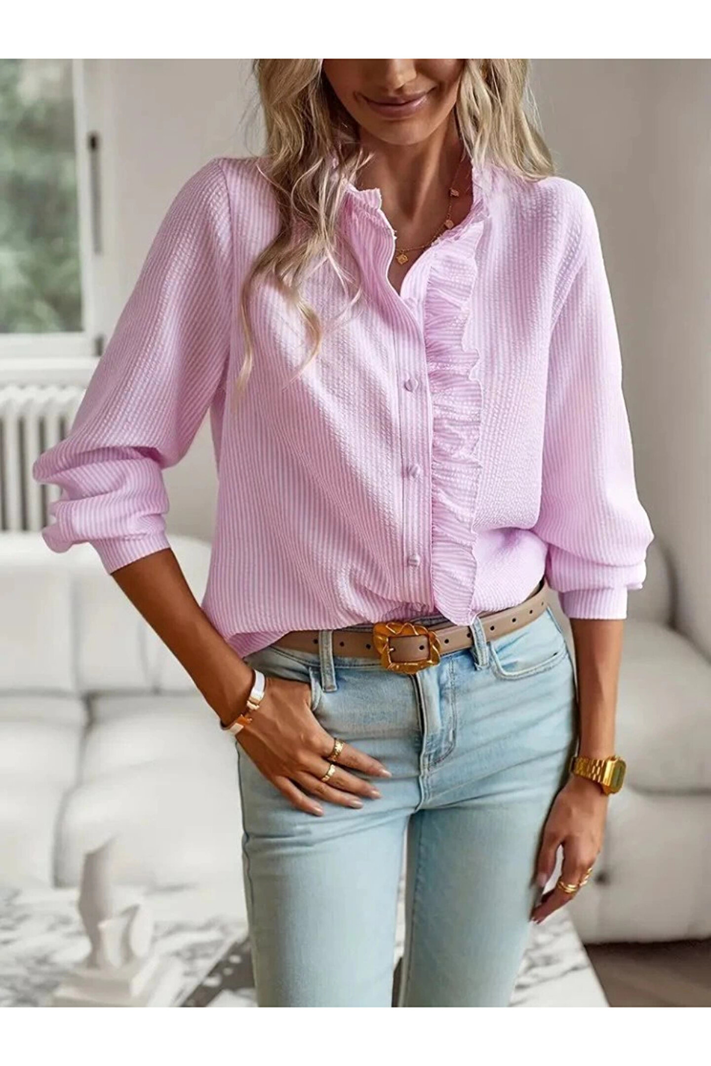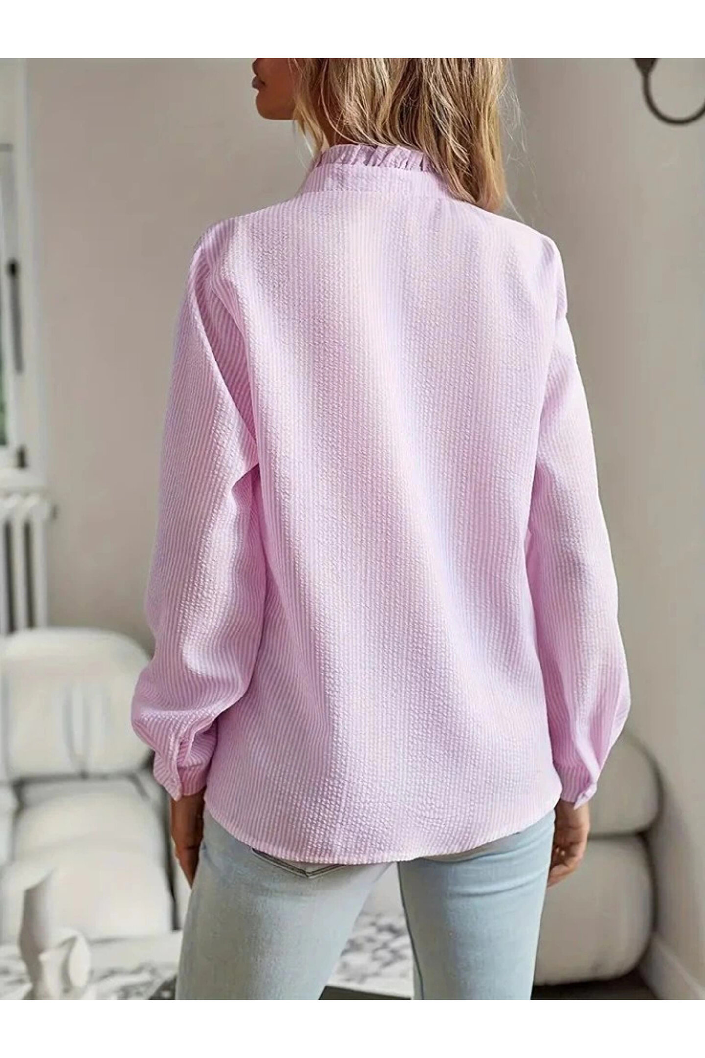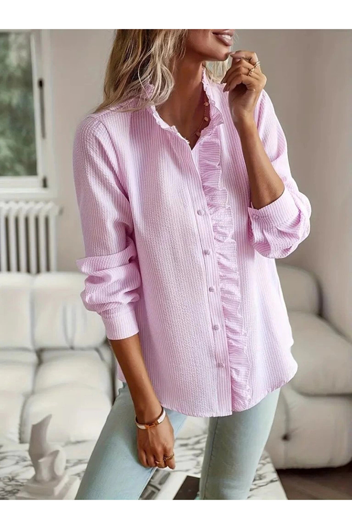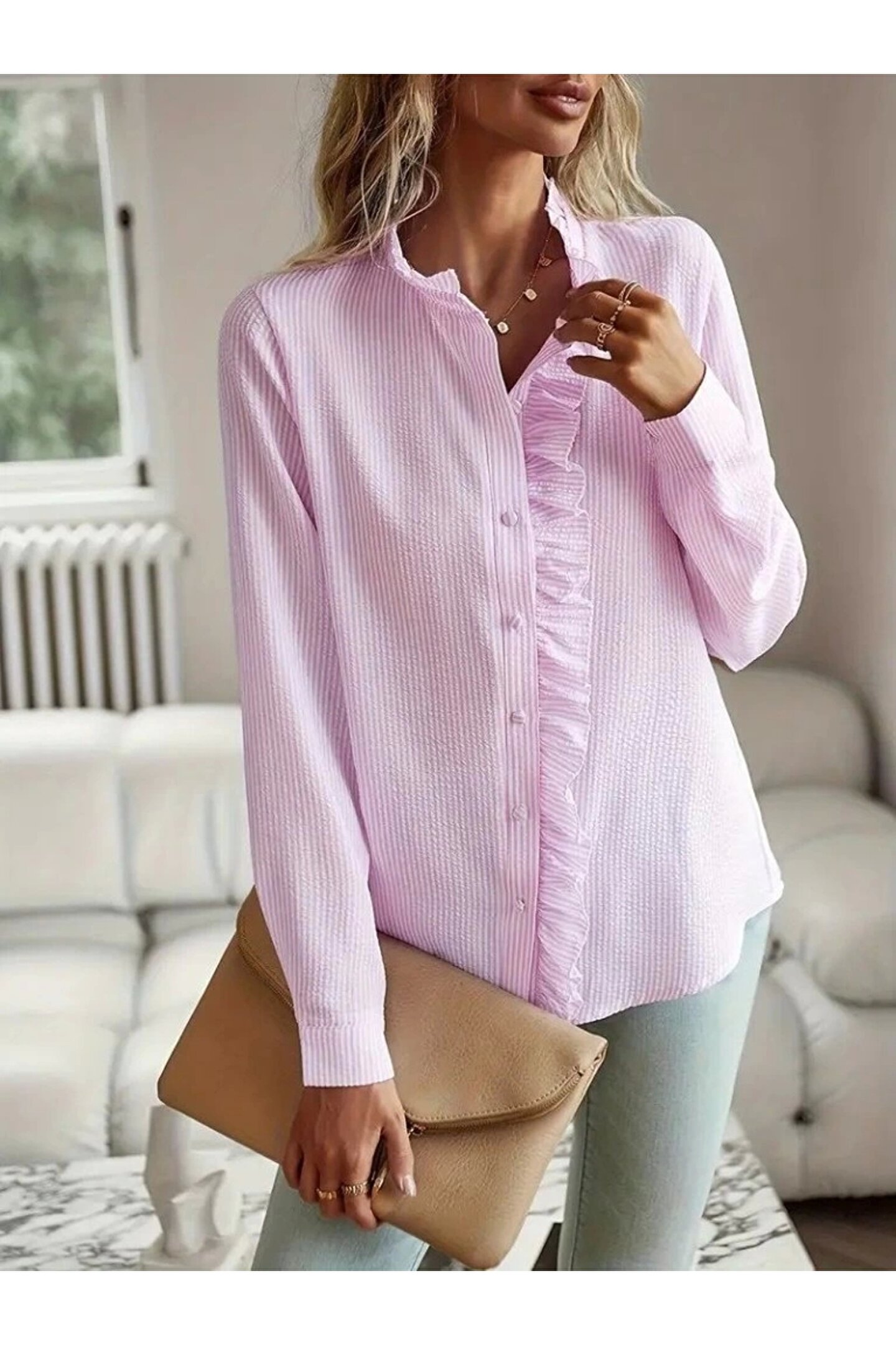 Kadın Uzun Kollu Fırfır Yakalı önden Düğmeli çizgili Burgu Gömlek