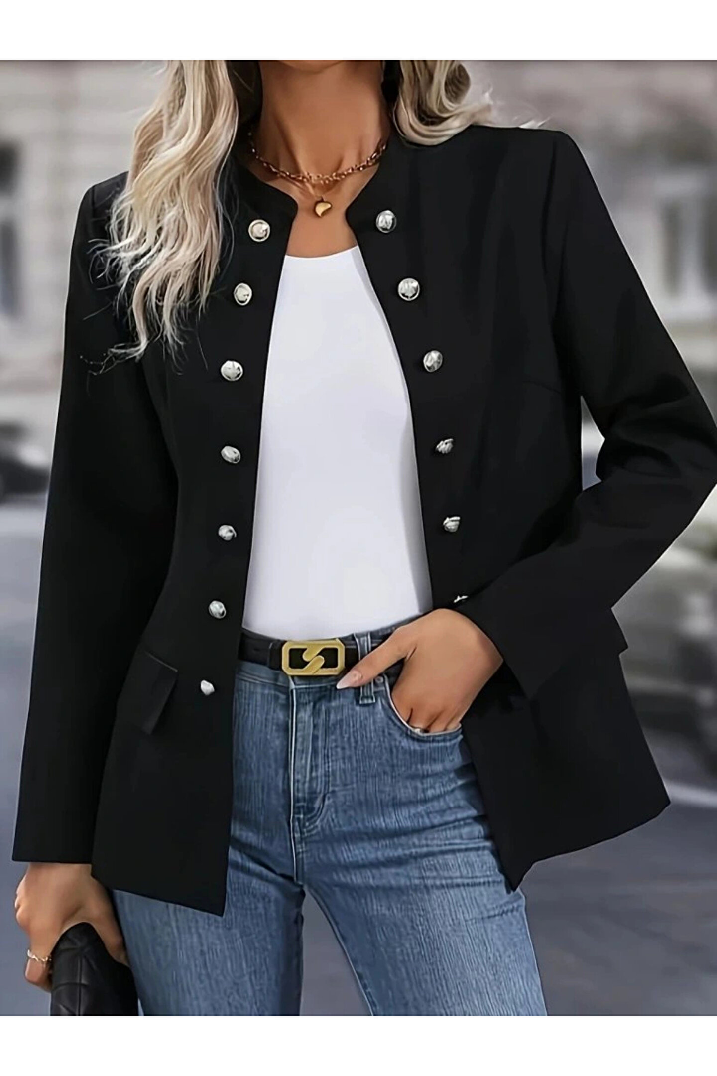 Kadın Uzun Kollu Hakim Yaka önden Düğmeli Kısa Atlas Ceket