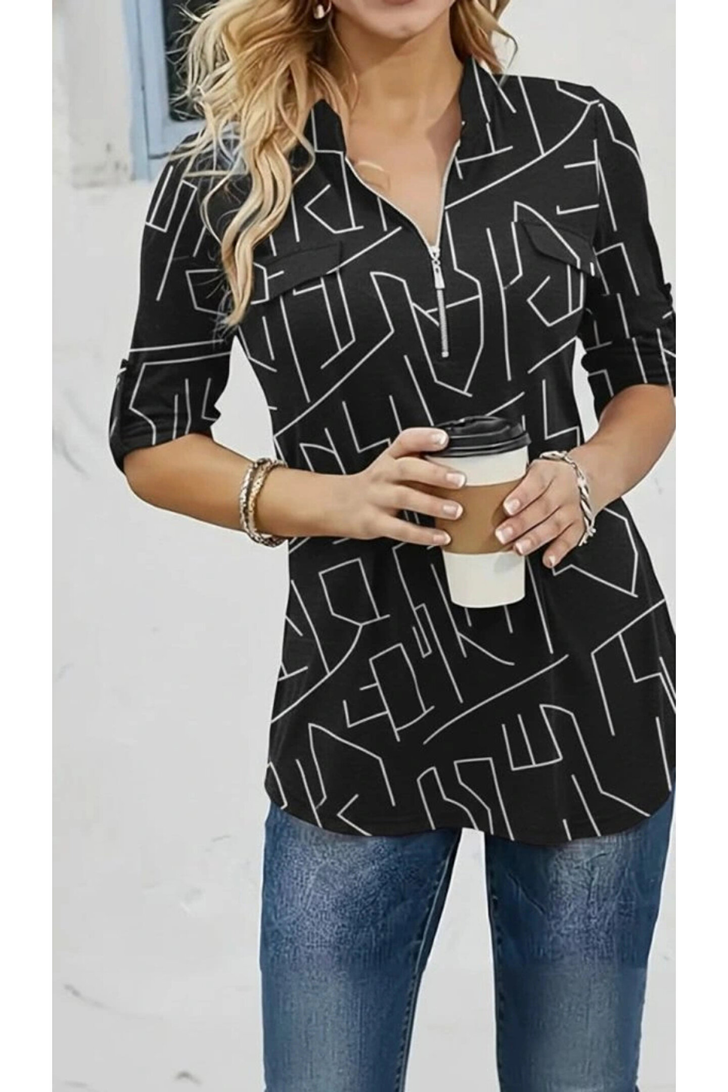Kadın Uzun Kollu Hakim Yaka Yakadan Fermuarlı Geometrik Desenli Süprem Bluz