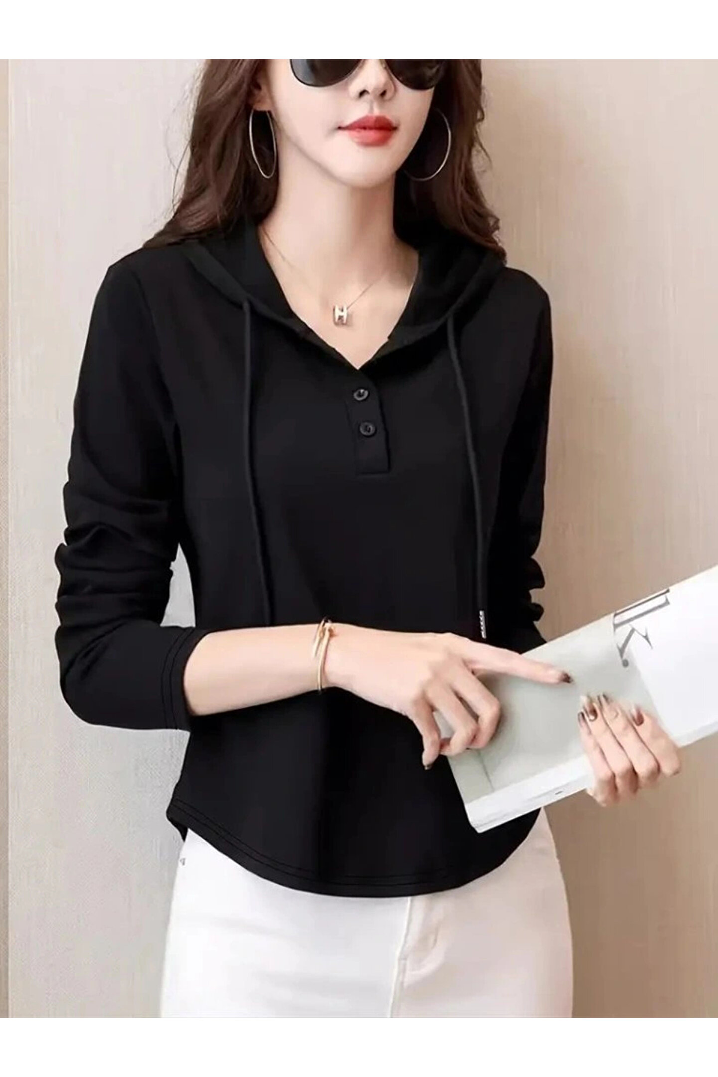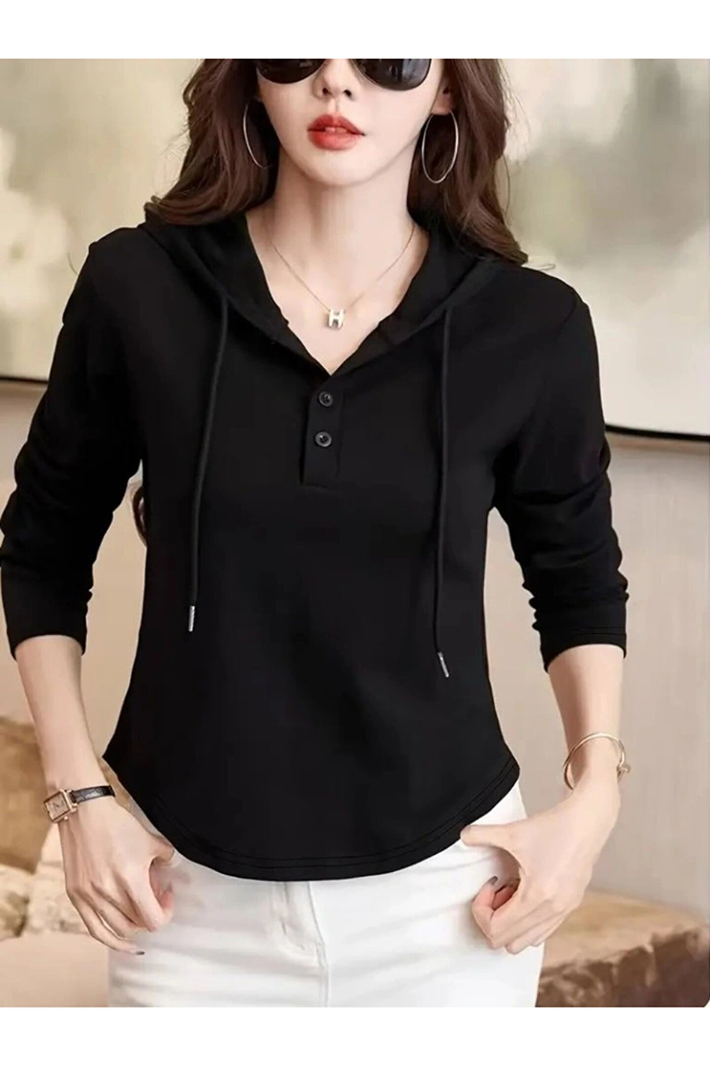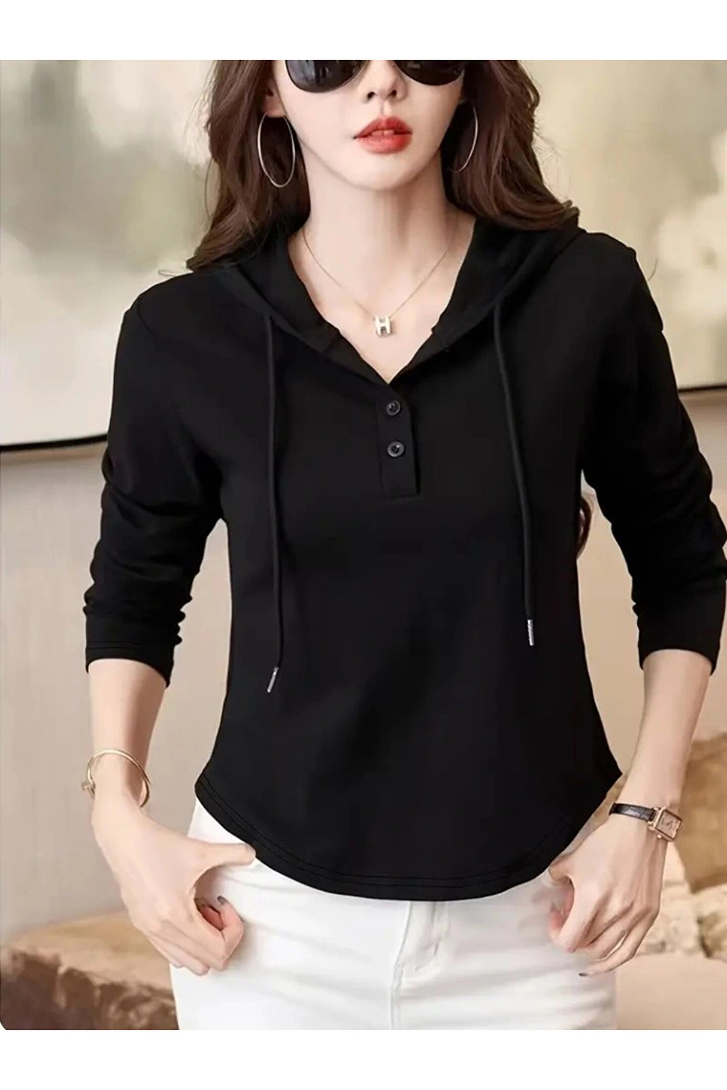 Kadın Uzun Kollu Kapşonlu Bağcıklı Düğmeli Viskon Iki Iplik Bluz