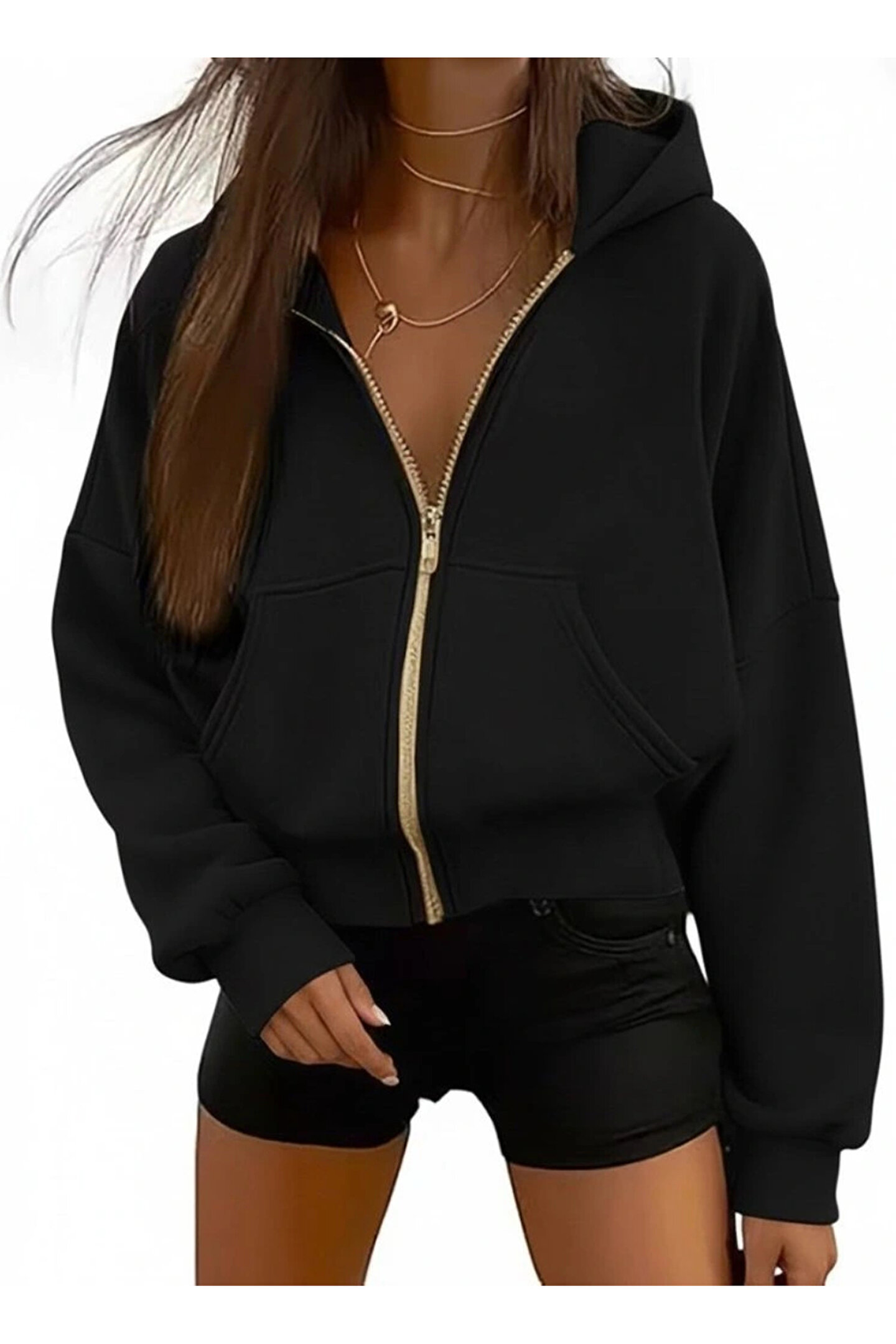 Kadın Uzun Kollu Kapşonlu Fermuarlı önden Cep Detaylı şardonlu Iki Iplik Ceket