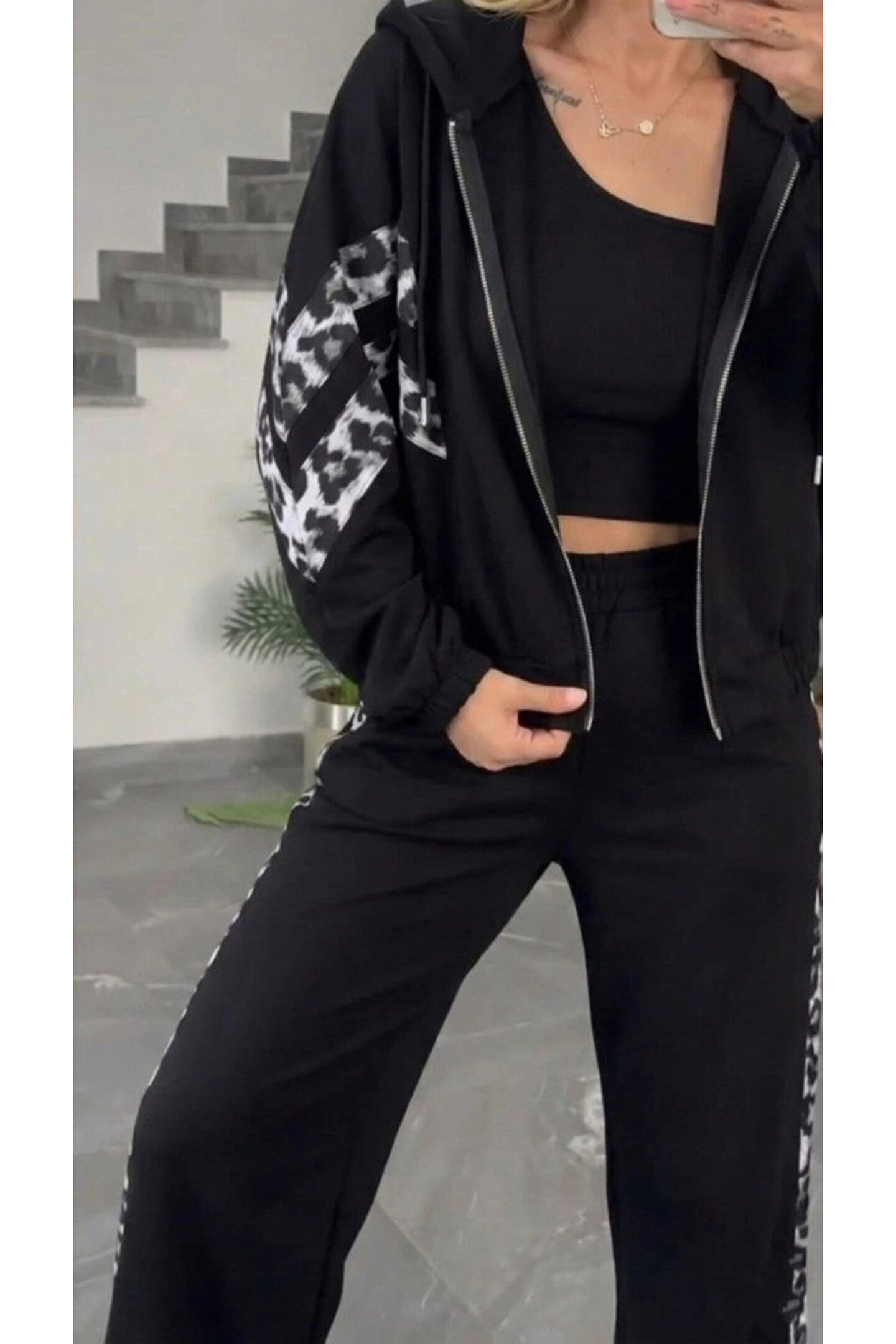 Kadın Uzun Kollu Kapşonlu önü Fermuarlı Leopar Desenli Modal Bluz Ve Pantolon Ikili Takım