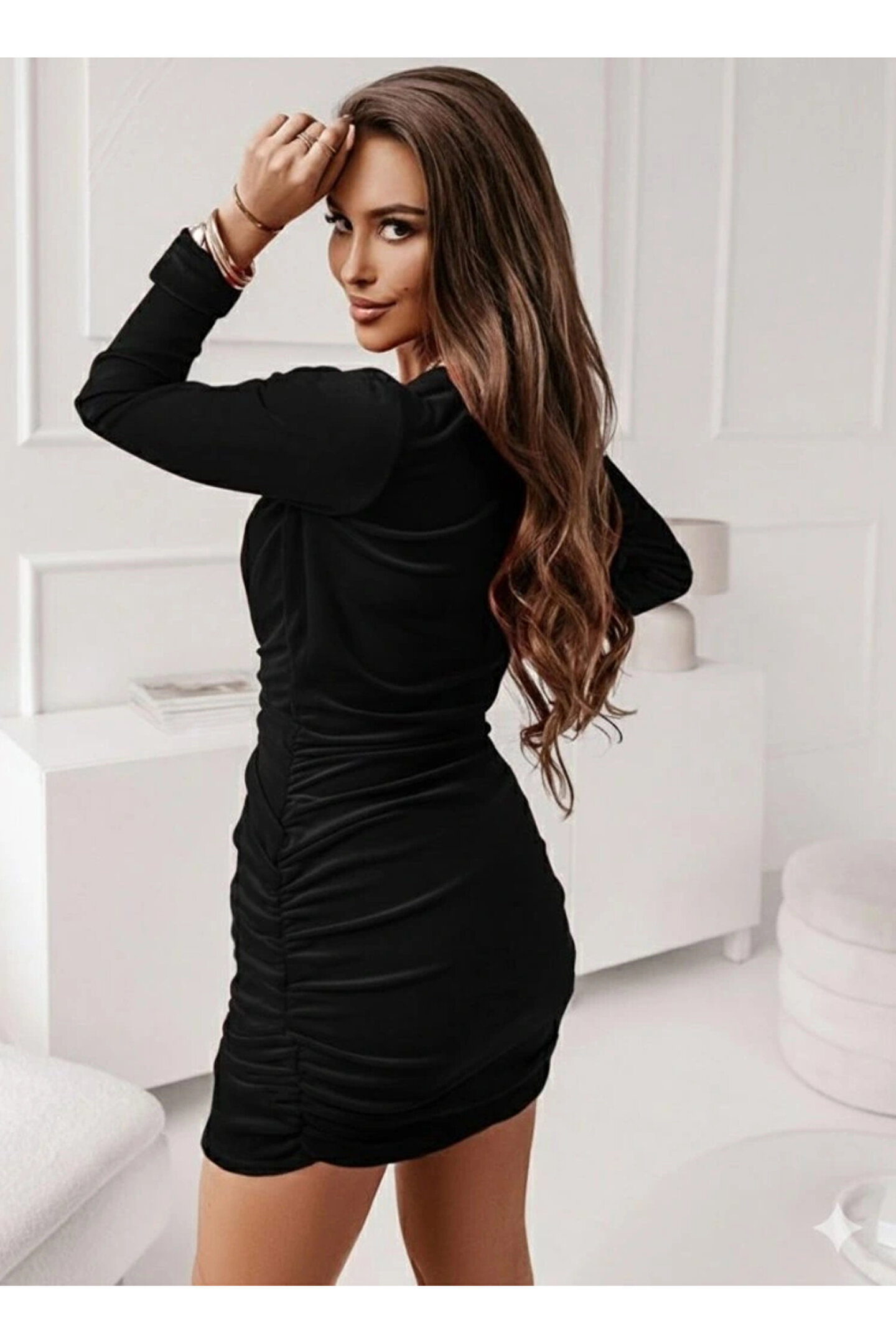 Kadın Uzun Kollu Kruvaze Yaka Yandan Büzgülü Mini Ithal Krep Elbise