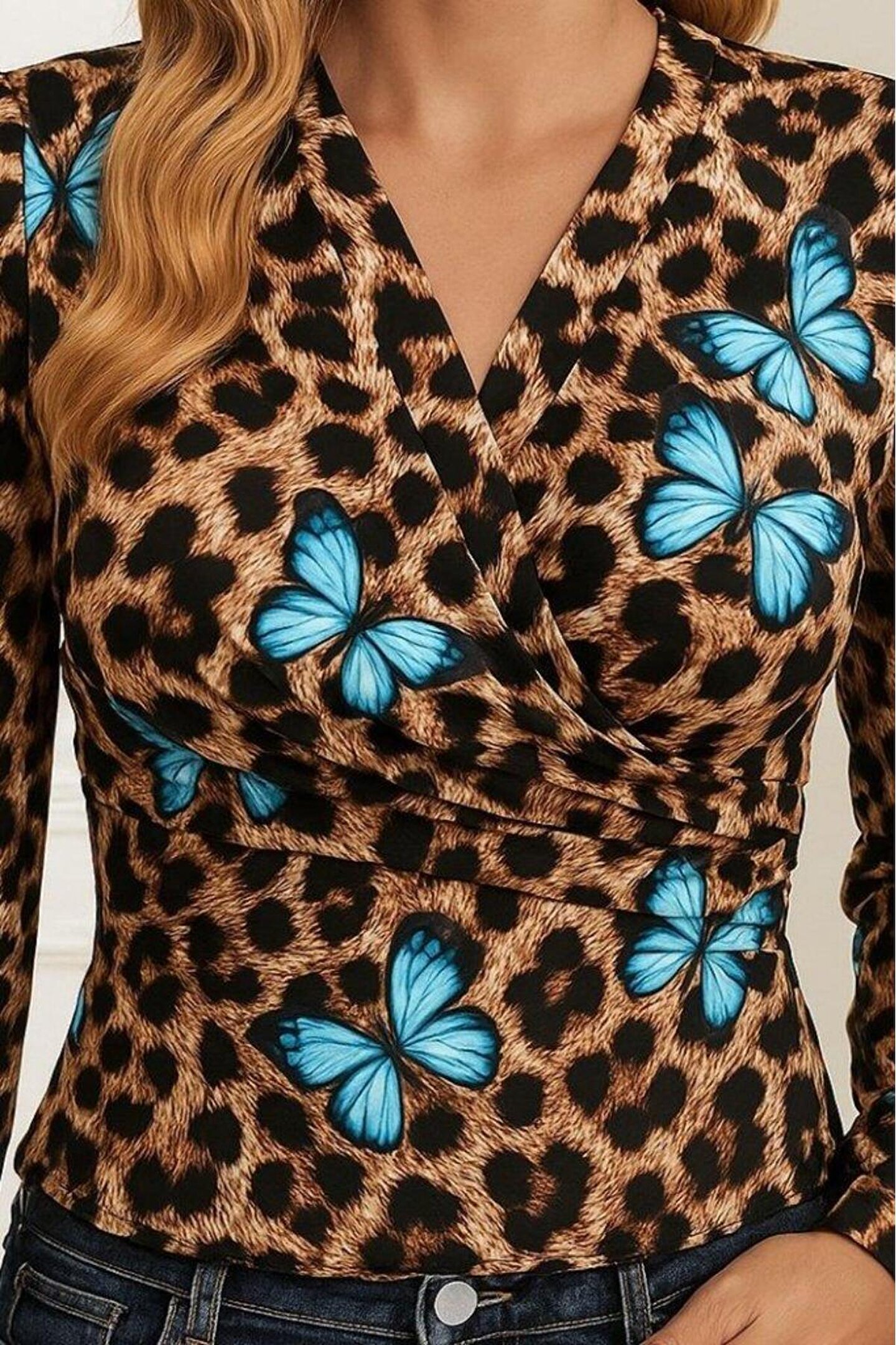 Kadın Uzun Kollu Kruvaze Yakalı Kelebek Desenli şardonlu Dalgıç Bluz