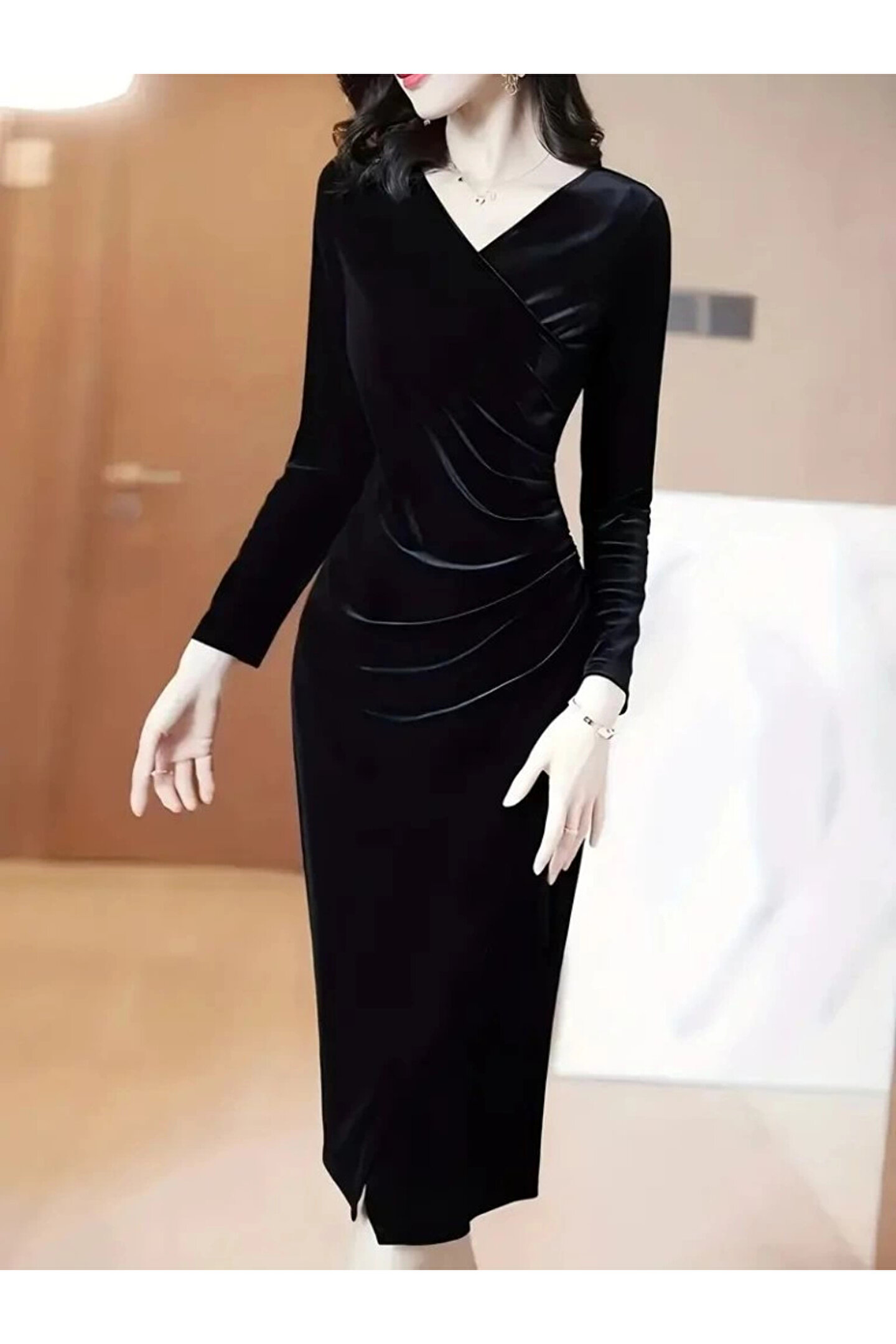 Kadın Uzun Kollu Kruvaze Yakalı Yandan Büzgülü önden çapraz Detaylı Midi Kadife Elbise