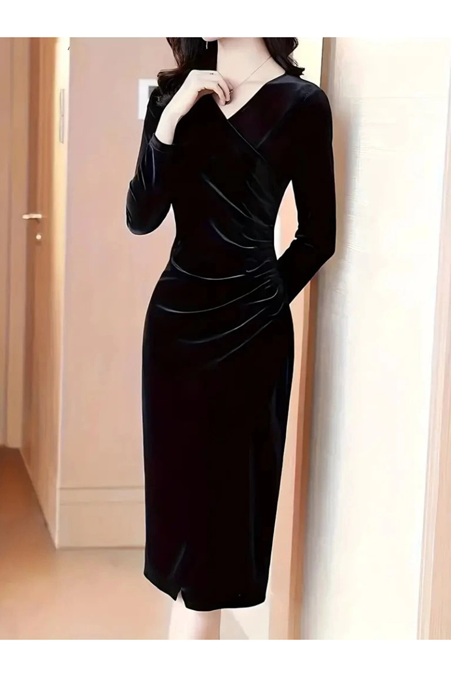 Kadın Uzun Kollu Kruvaze Yakalı Yandan Büzgülü önden çapraz Detaylı Midi Kadife Elbise