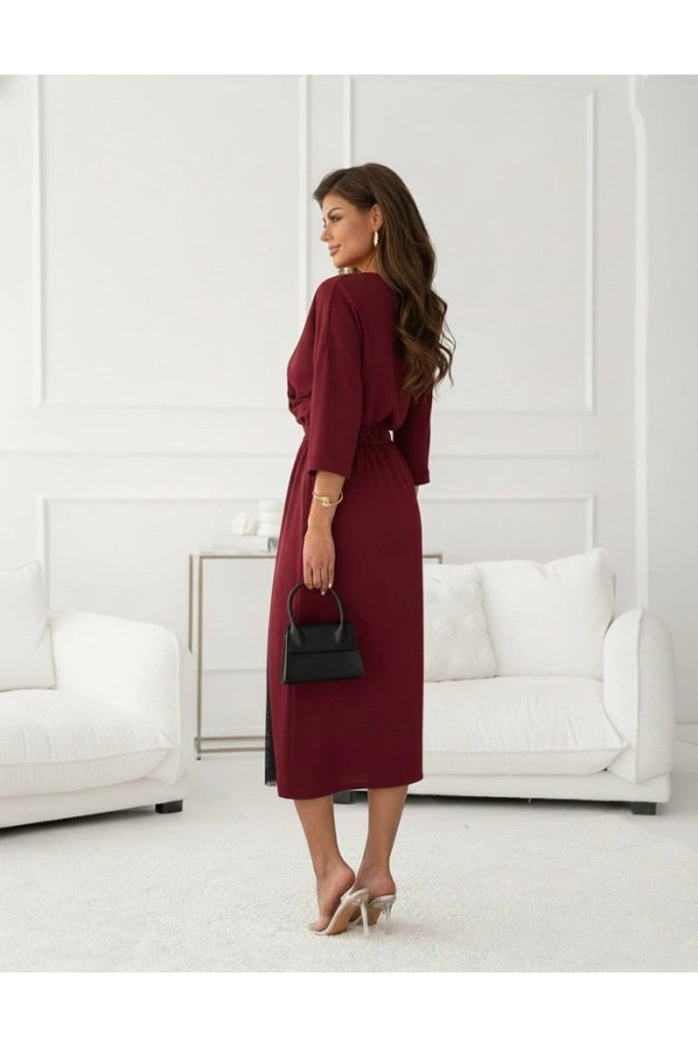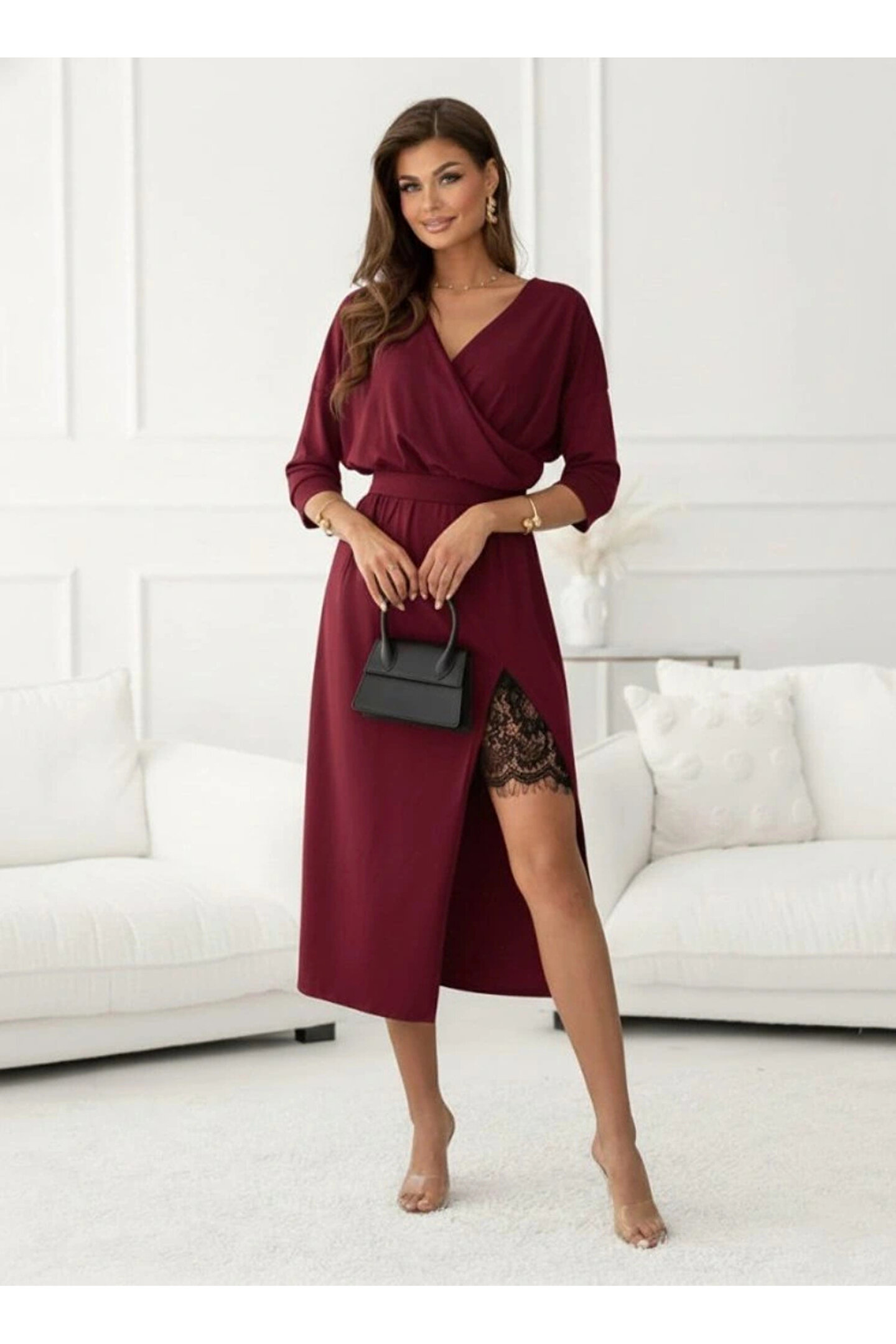 Kadın Uzun Kollu Kruvaze Yakalı Yandan Dantelli Midi Ithal Krep Elbise