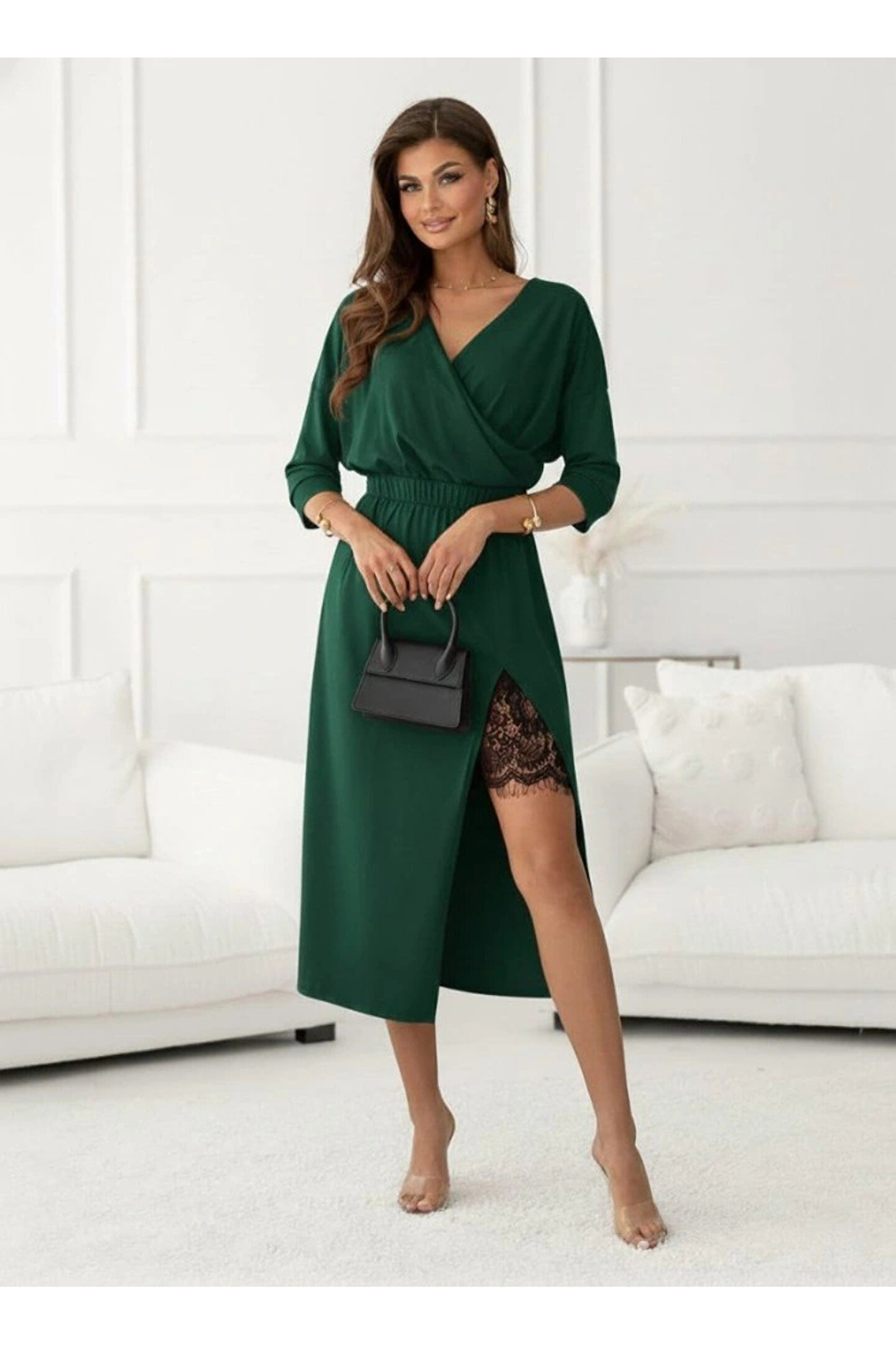 Kadın Uzun Kollu Kruvaze Yakalı Yandan Dantelli Midi Ithal Krep Elbise