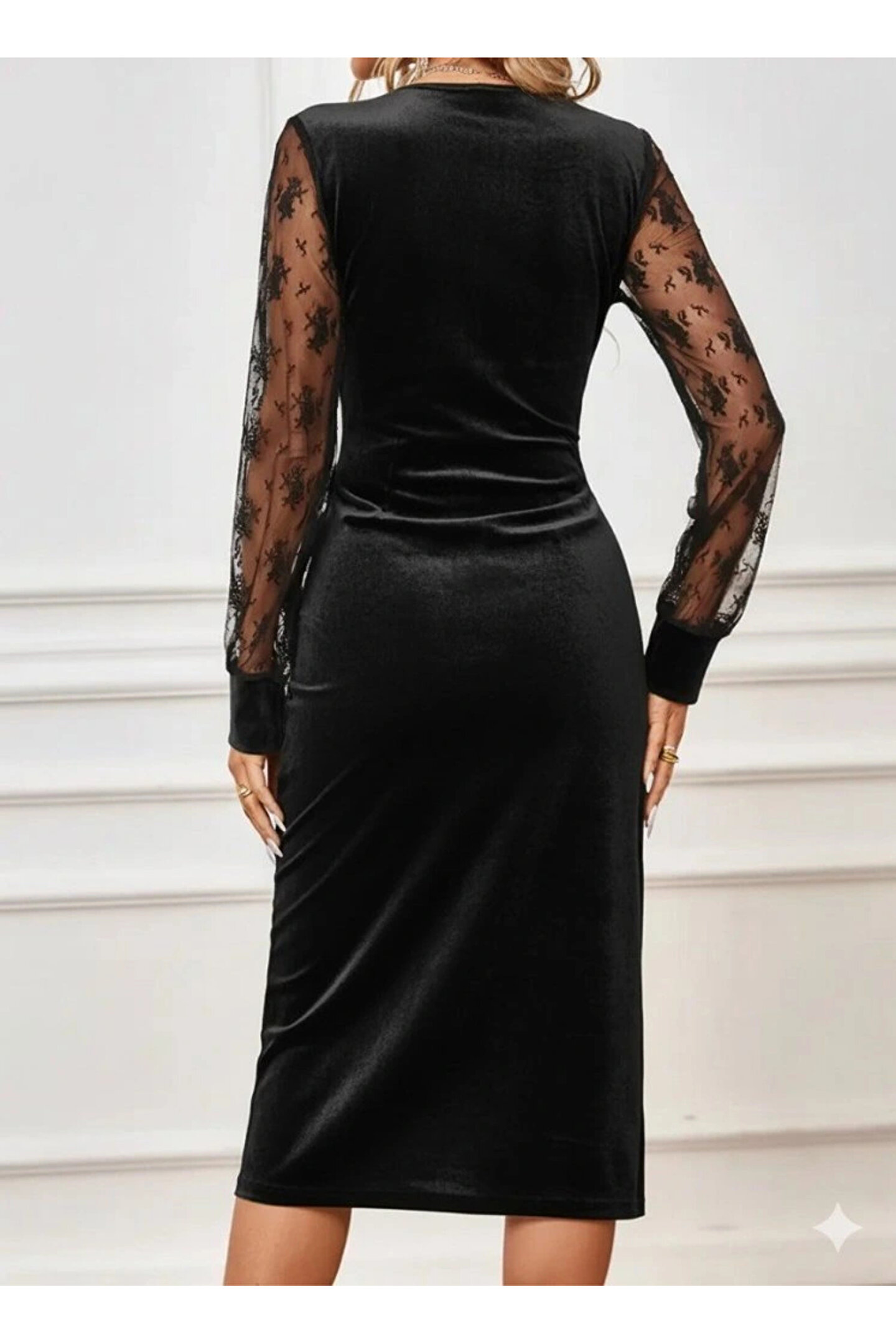 Silerra Kadın Uzun Kollu Kruvaze Yakalı Yandan Düğmeli önden çapraz Kesin Detaylı Midi Kadife Elbise