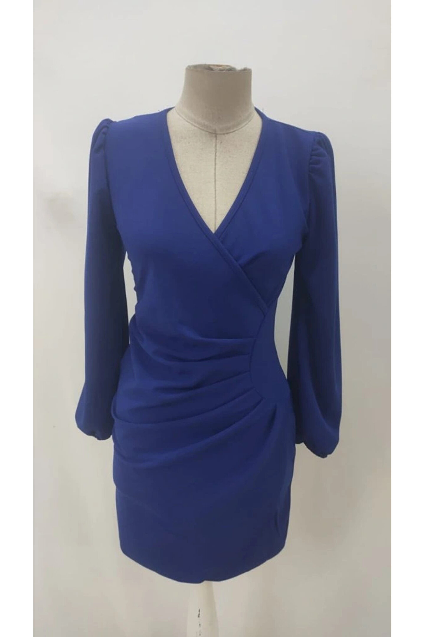 Kadın Uzun Kollu Kruvaze Yakalı Yanlardan Büzgü Detaylı Ithal Krep Kısa Elbise
