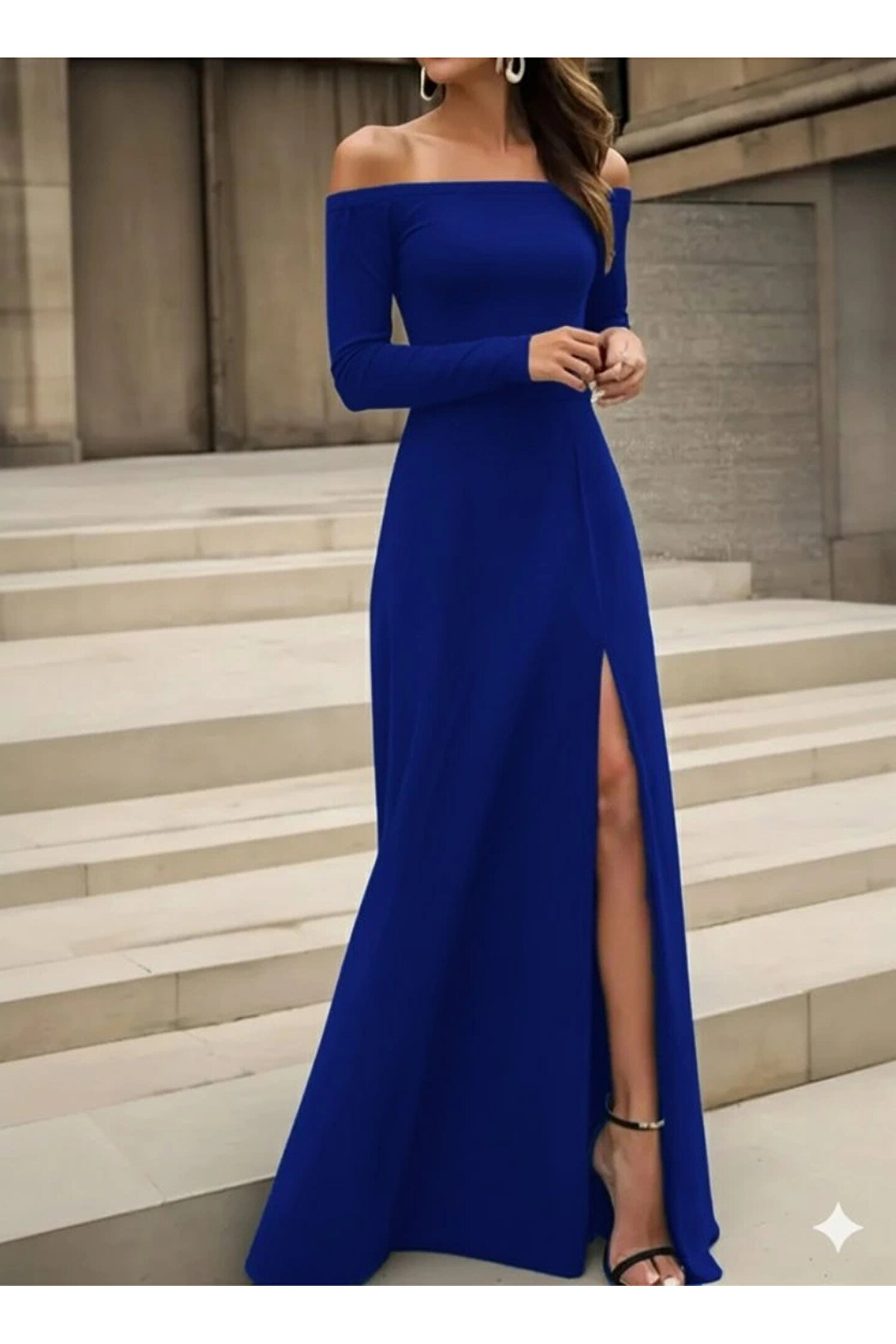 Kadın Uzun Kollu Madonna Yakalı Yırtmaç Detaylı Uzun Ithal Krep Elbise