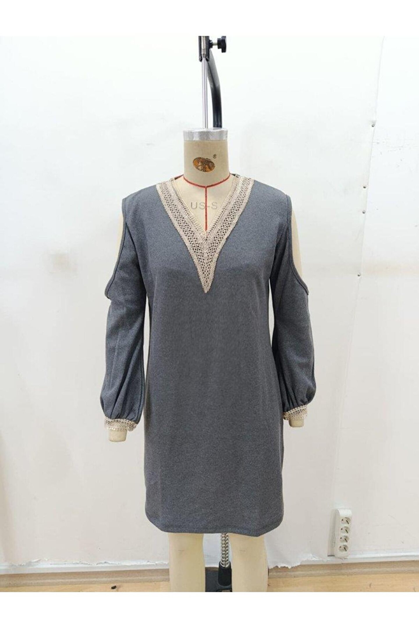 Silerra Kadın Uzun Kollu Omuzdan Açık V Dantel Yakalı Mini Waffle Elbise