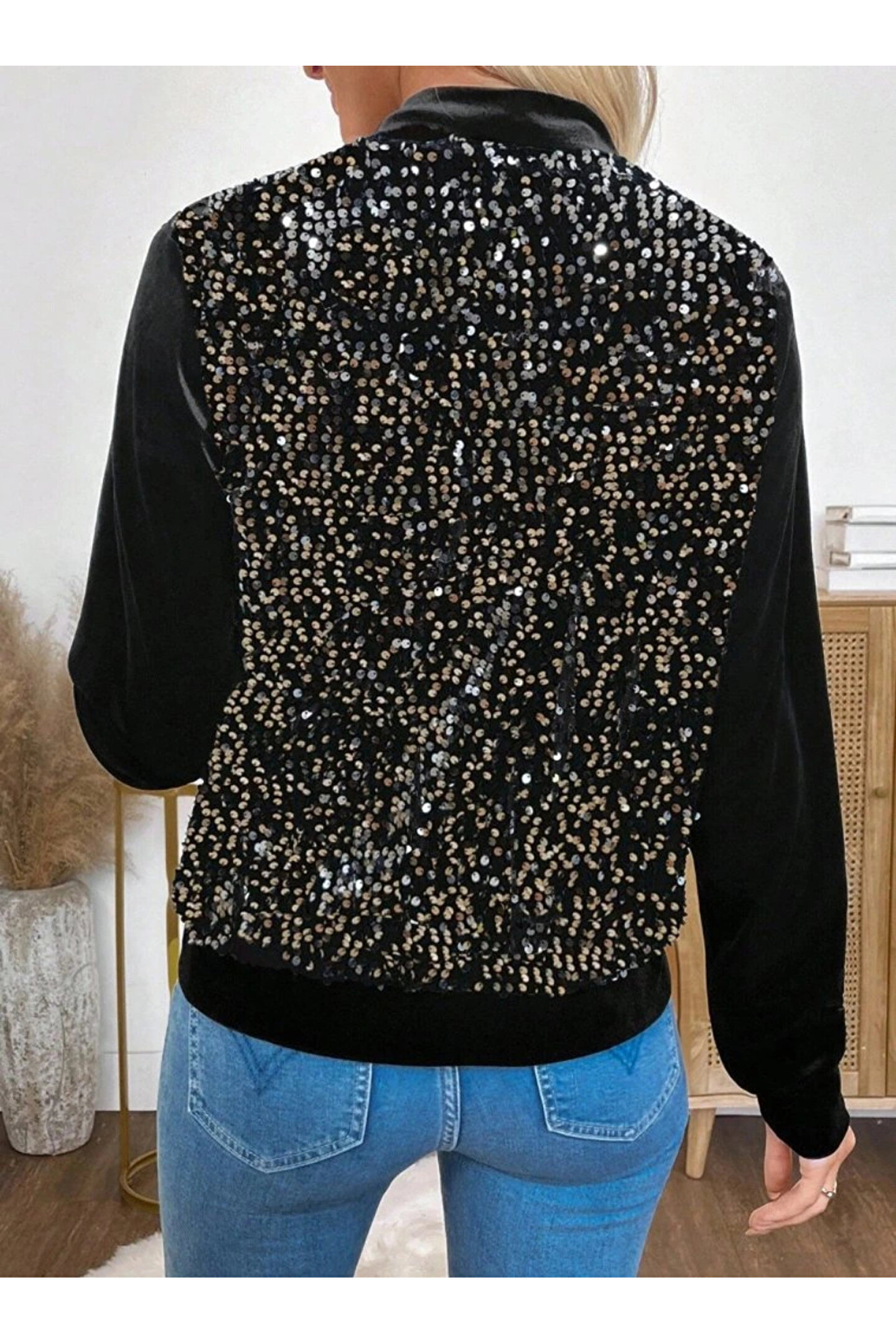 Kadın Uzun Kollu önü Açık Fermuarlı Pulpayetli Kadife Ceket