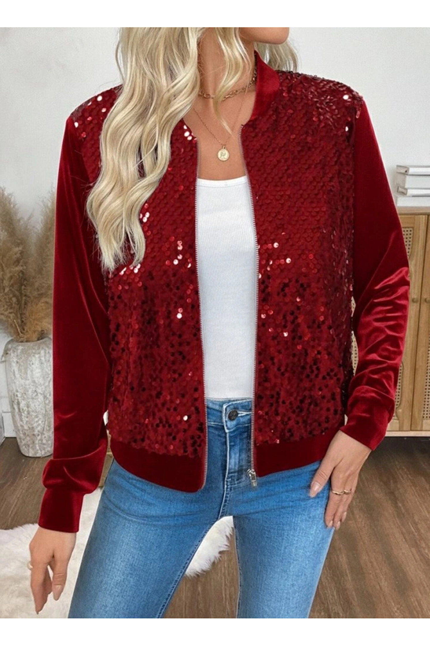 Kadın Uzun Kollu önü Açık Fermuarlı Pulpayetli Kadife Ceket