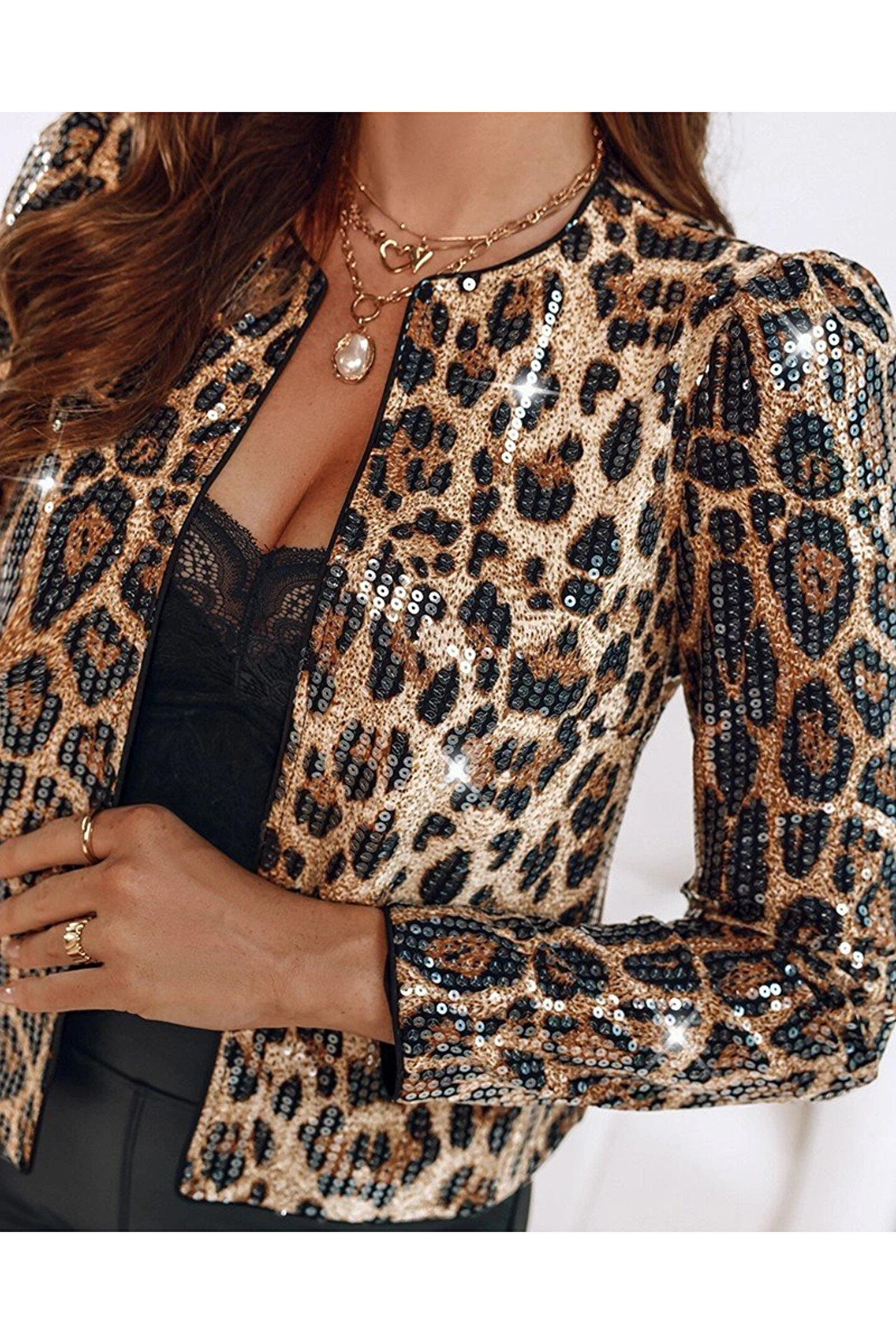 Kadın Uzun Kollu önü Açık Pulpayet Detaylı Leopar Desenli Kısa Ceket