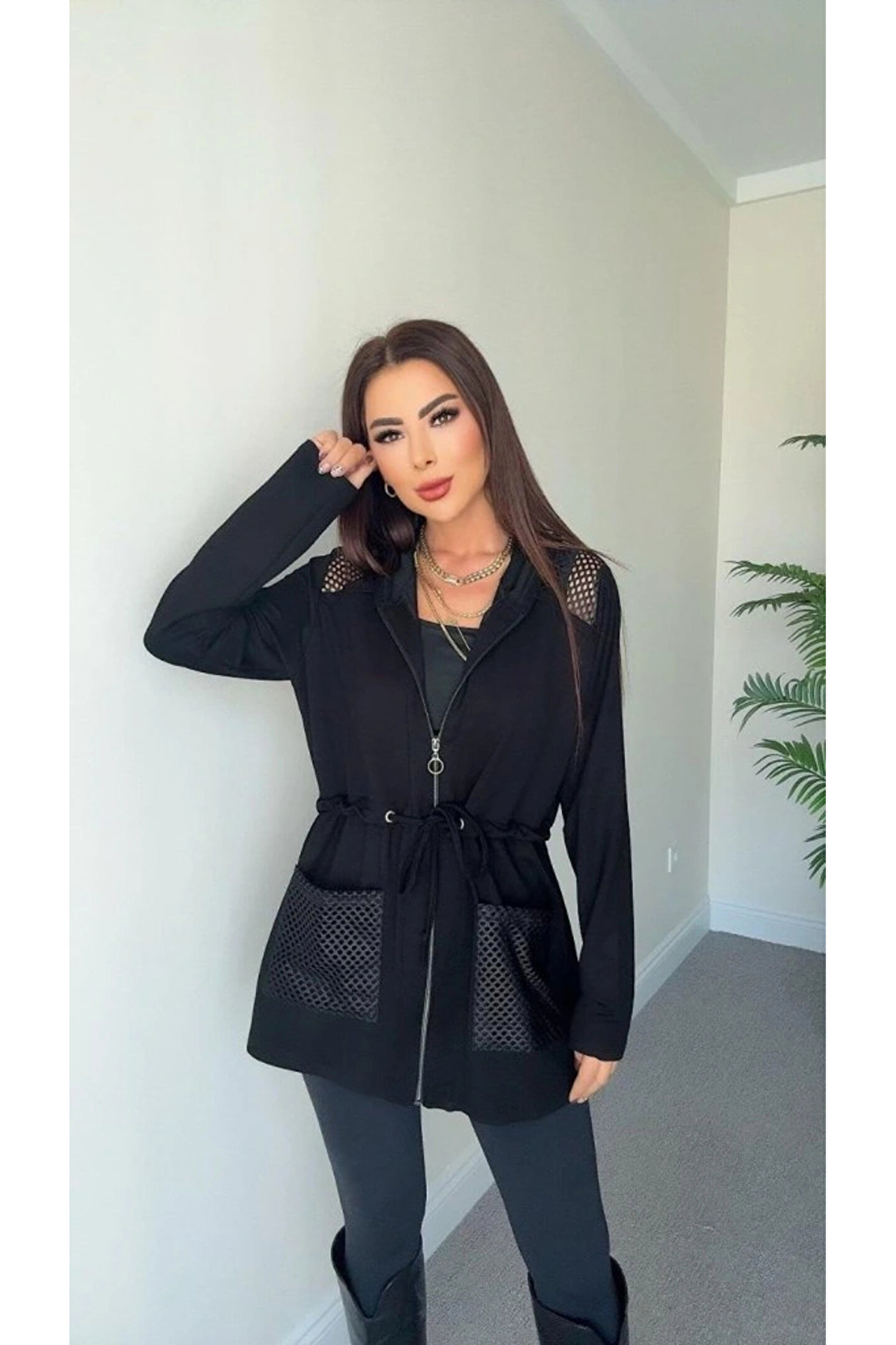 Kadın Uzun Kollu önü Fermuarlı File Detaylı Belden Bağcıklı Kısa Modal Ceket