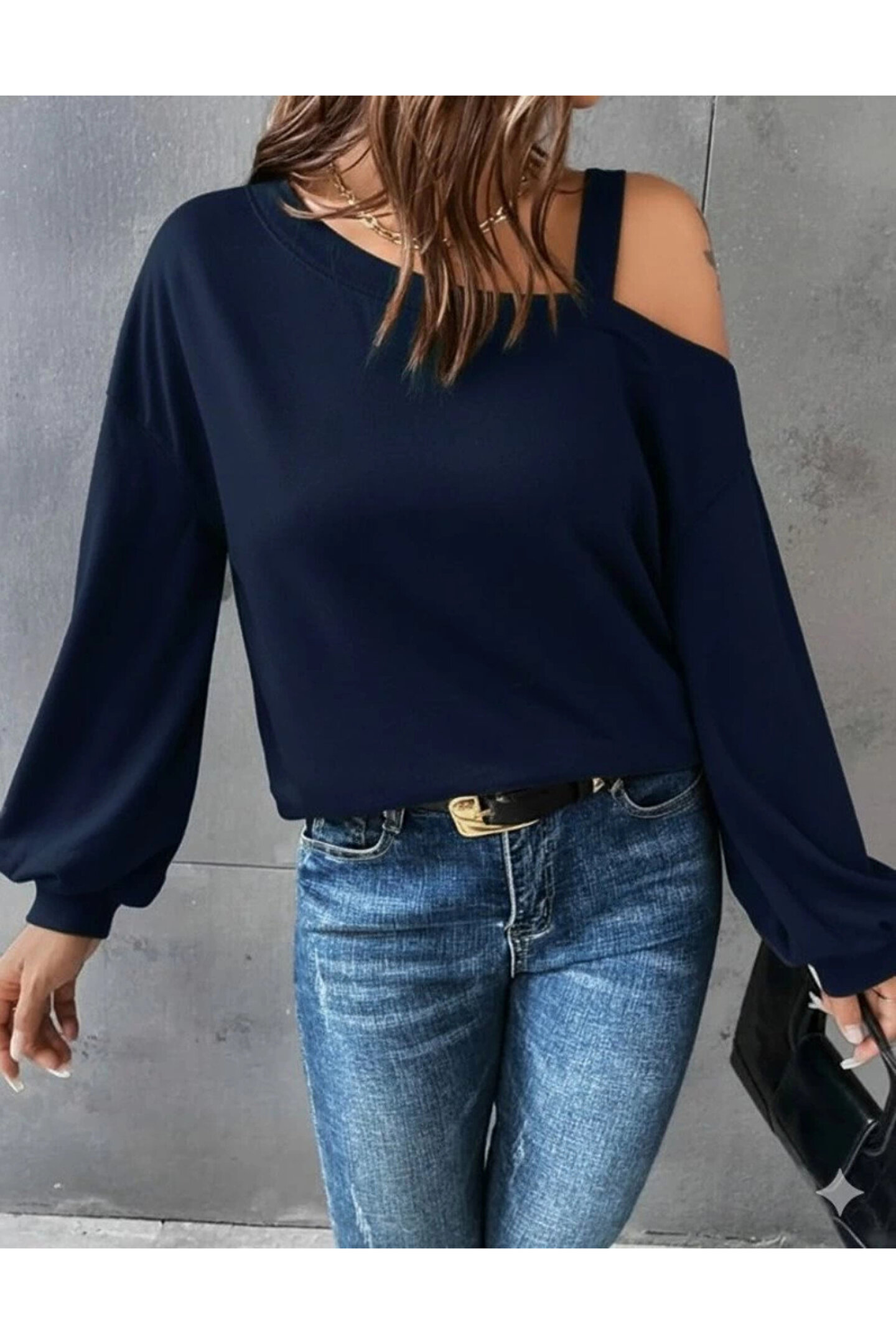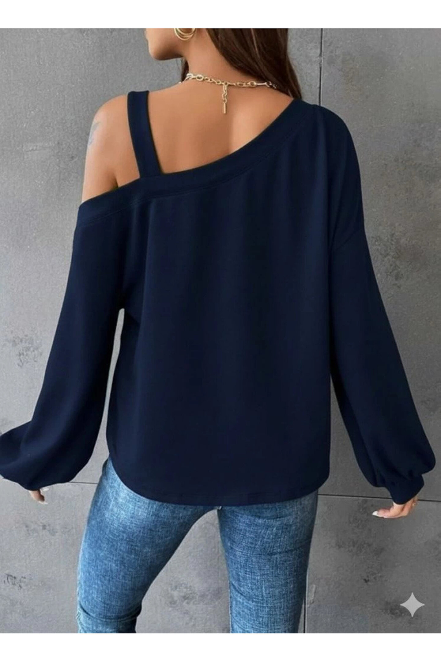 Kadın Uzun Kollu Tek Omuz Askı Detay Salaş Viskon Iki Iplik Bluz