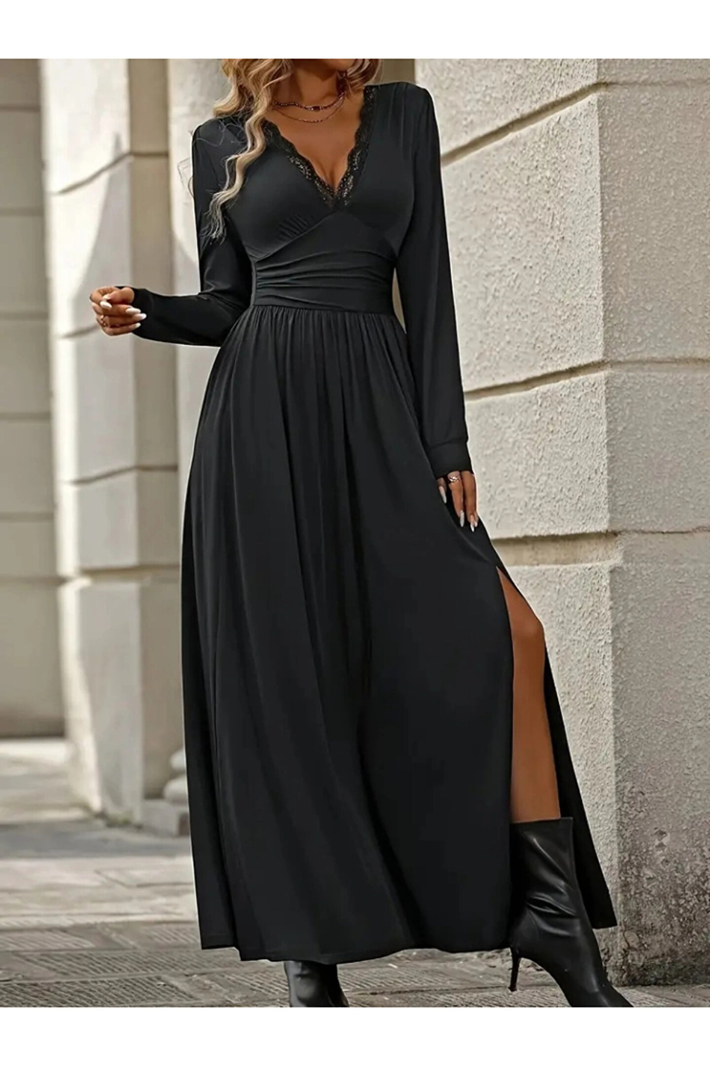 Kadın Uzun Kollu V Dantel Yakalı Yırtmaçlı Uzun Sandy Elbise