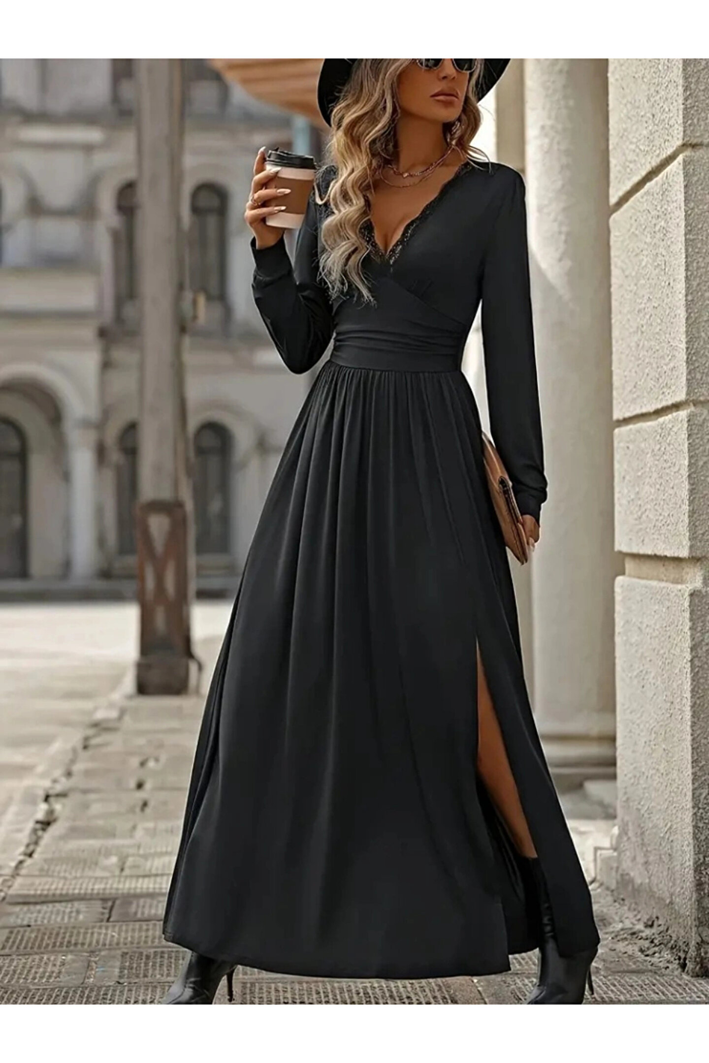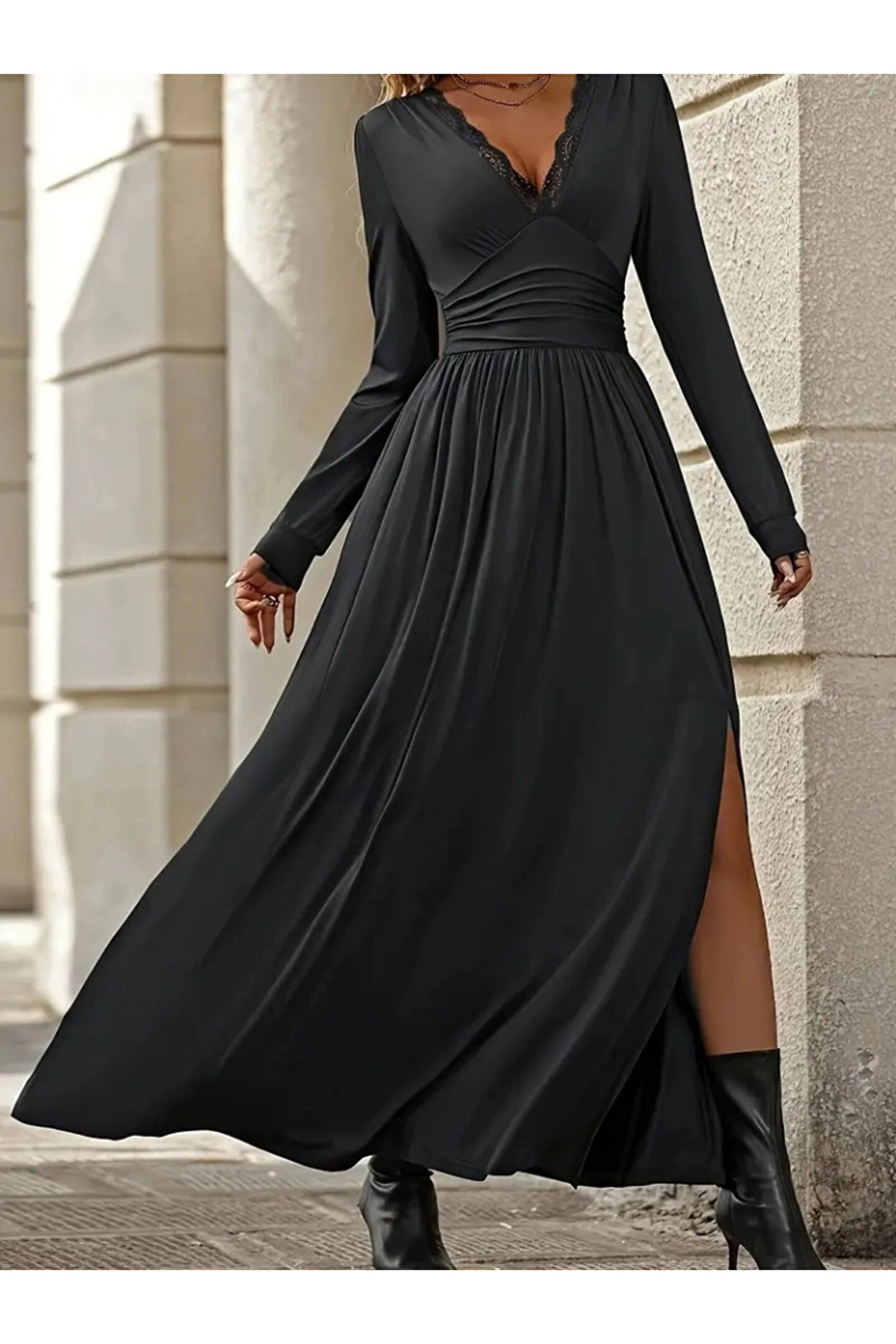 Kadın Uzun Kollu V Dantel Yakalı Yırtmaçlı Uzun Sandy Elbise