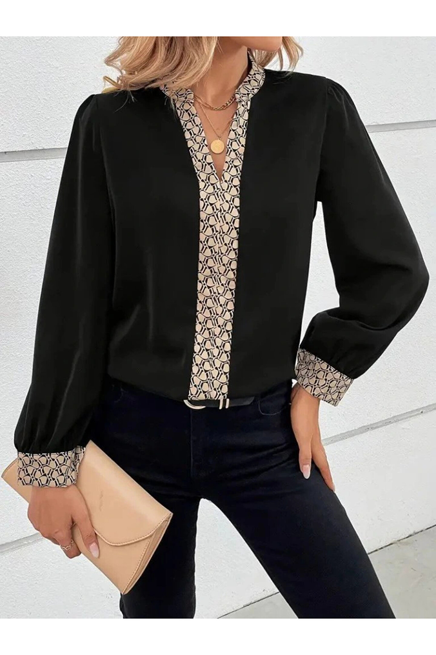 Kadın Uzun Kollu V Hakim Yakalı Desenli Ithal Krep Bluz