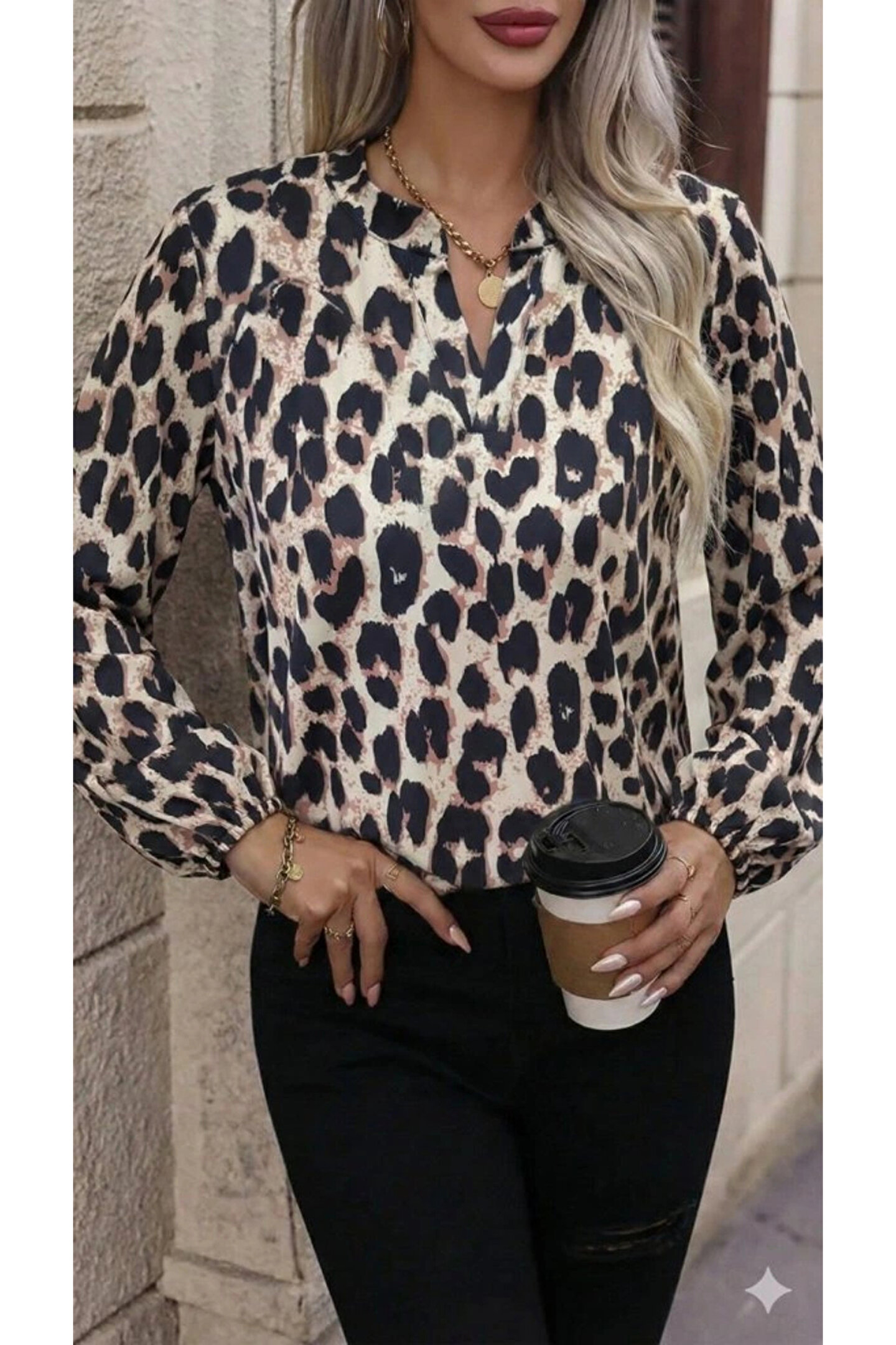 Kadın Uzun Kollu V Hakim Yakalı Leopar Desenli Süprem Bluz