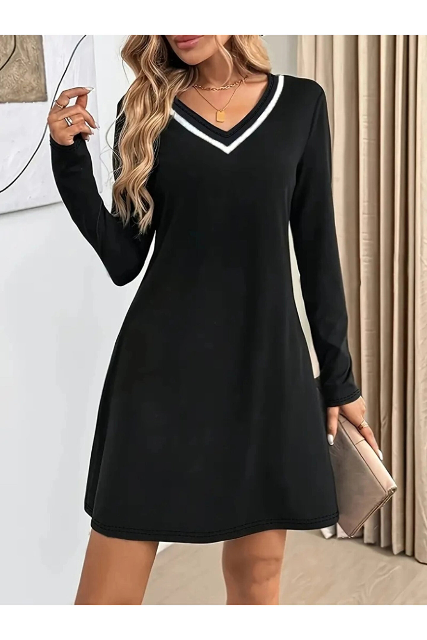 Kadın Uzun Kollu V şerit Yakalı Kısa Viskon Iki Iplik Elbise