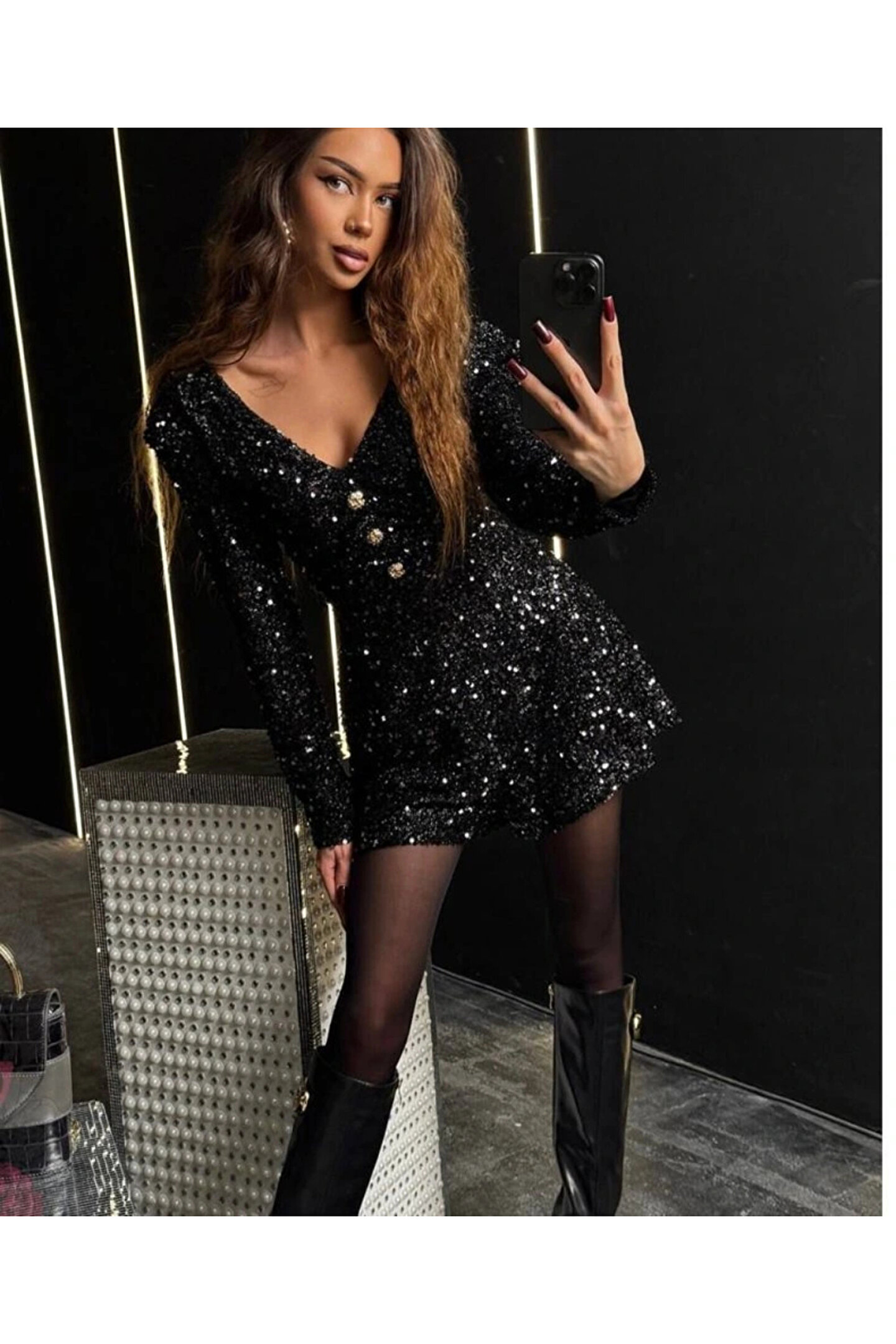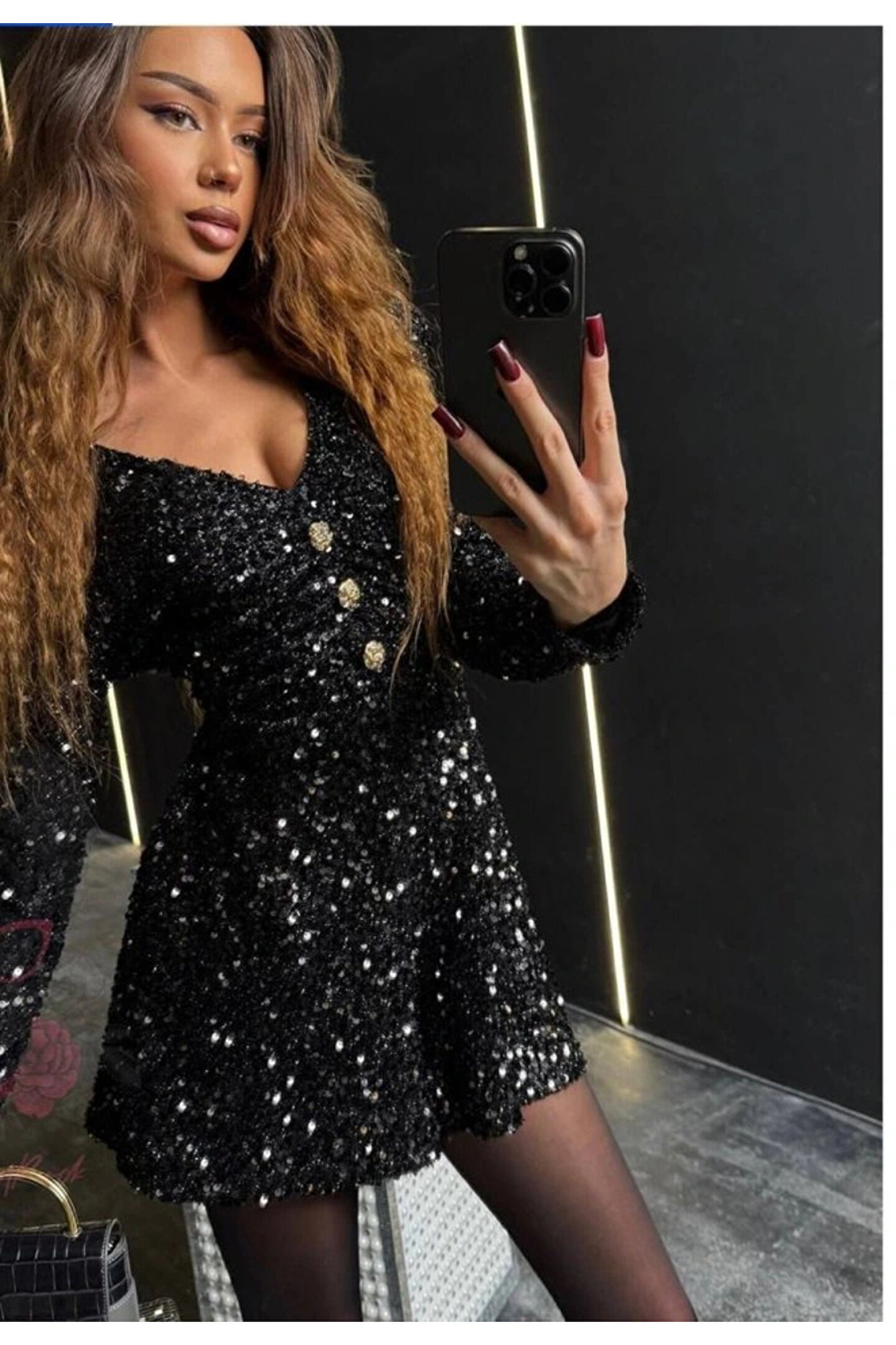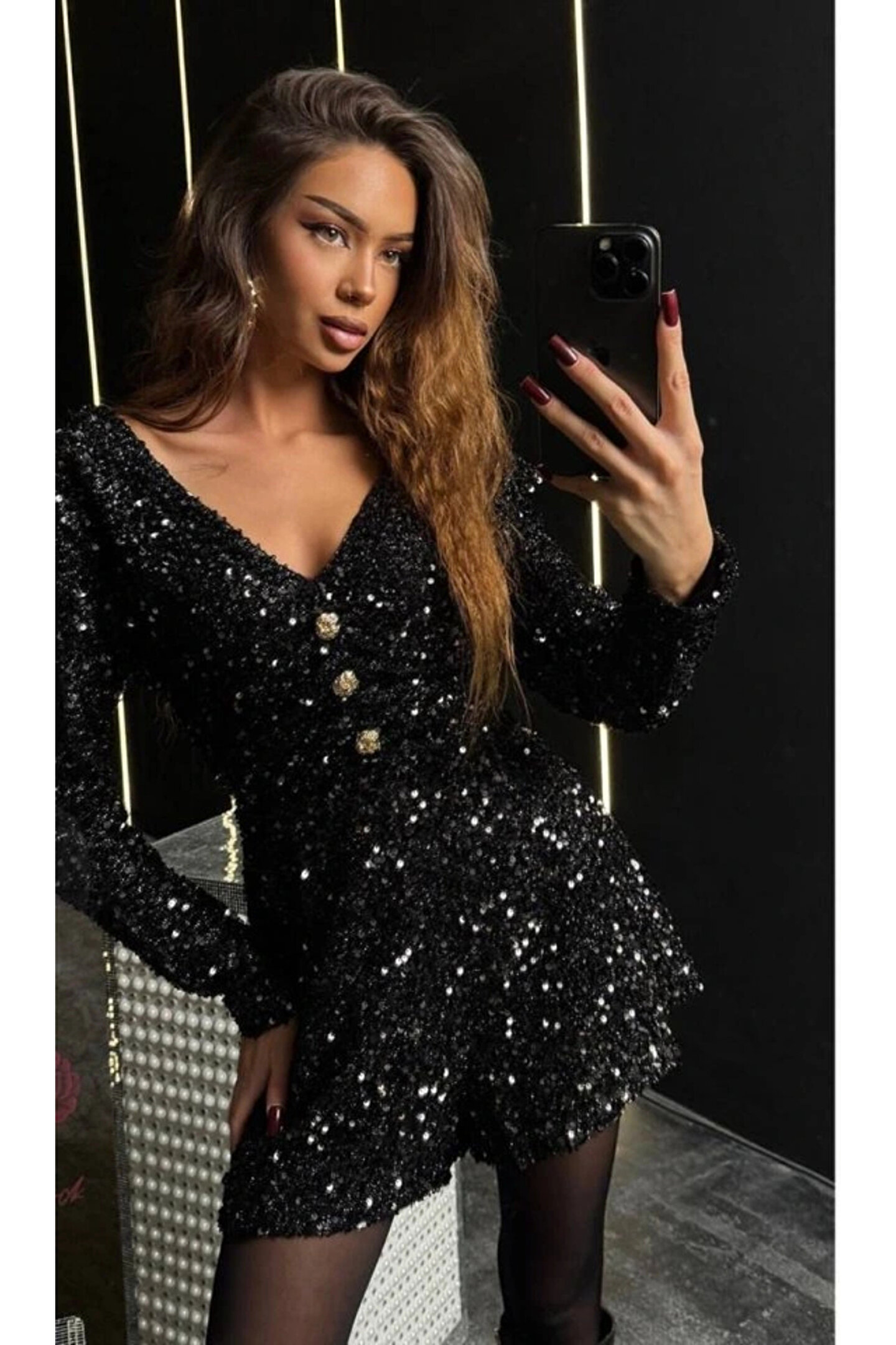 Kadın Uzun Kollu V Yaka Düğme Detay Ful Pul Payet Elbise