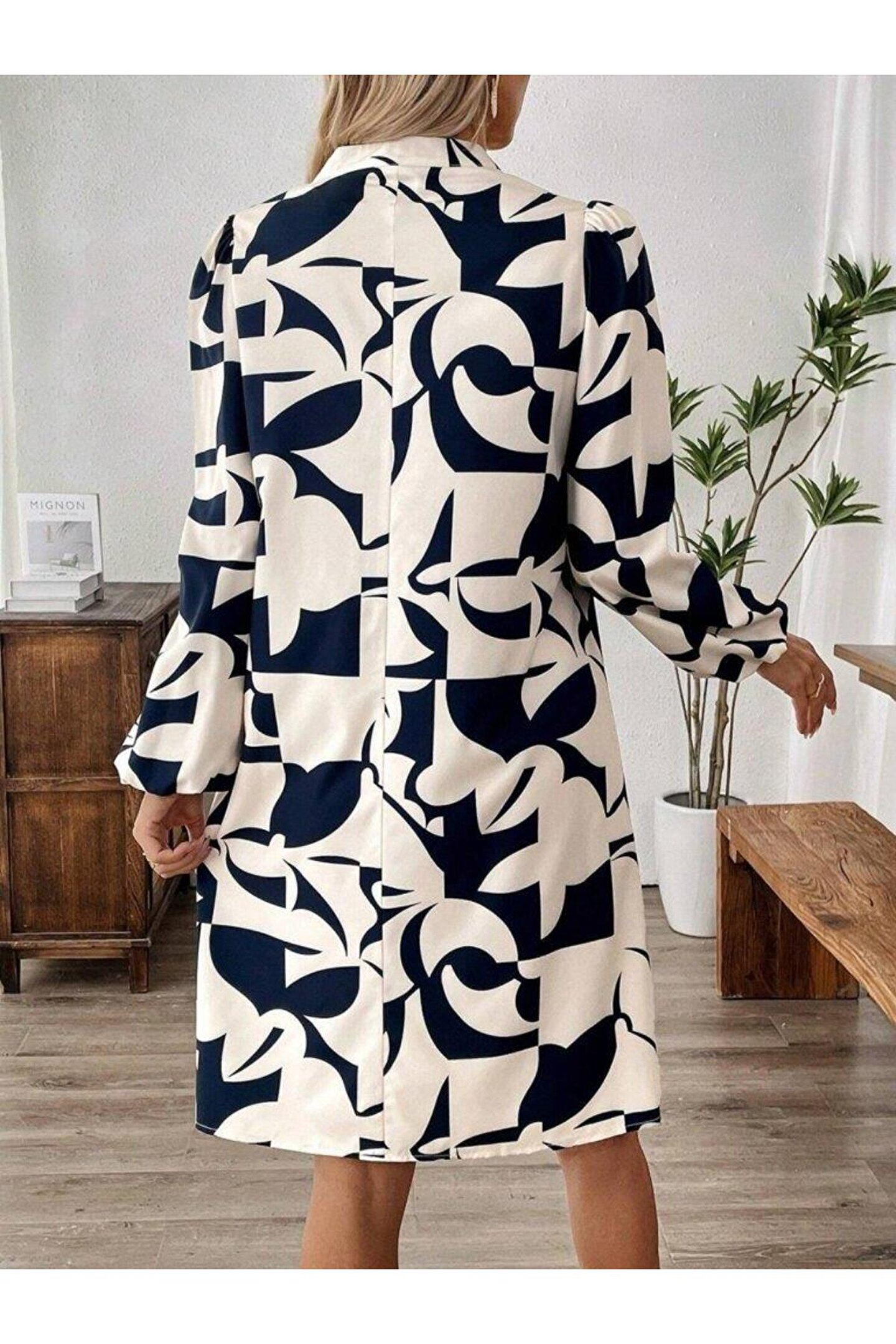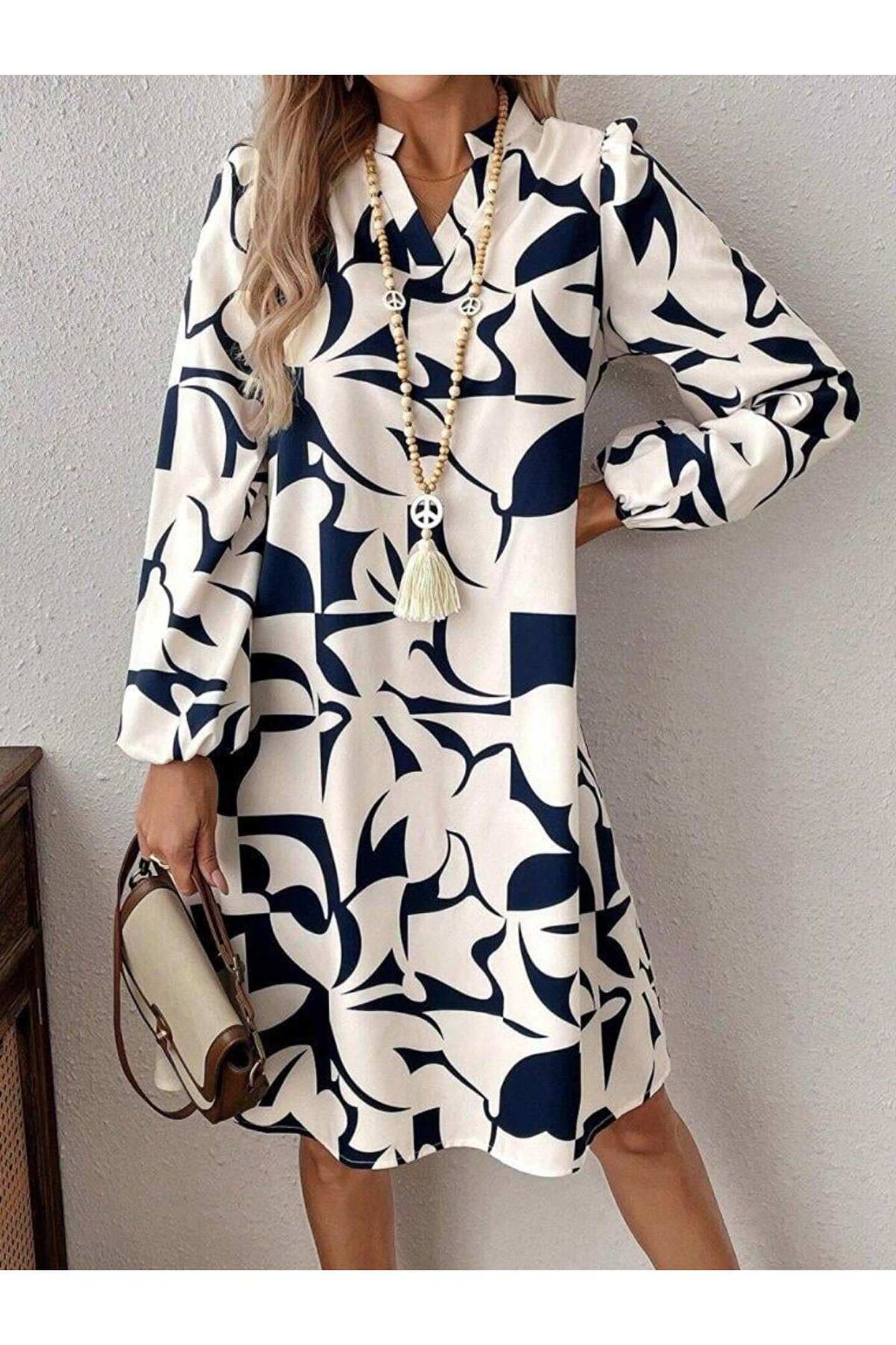 Kadın Uzun Kollu V Yakalı Desenli Modal Mini Elbise