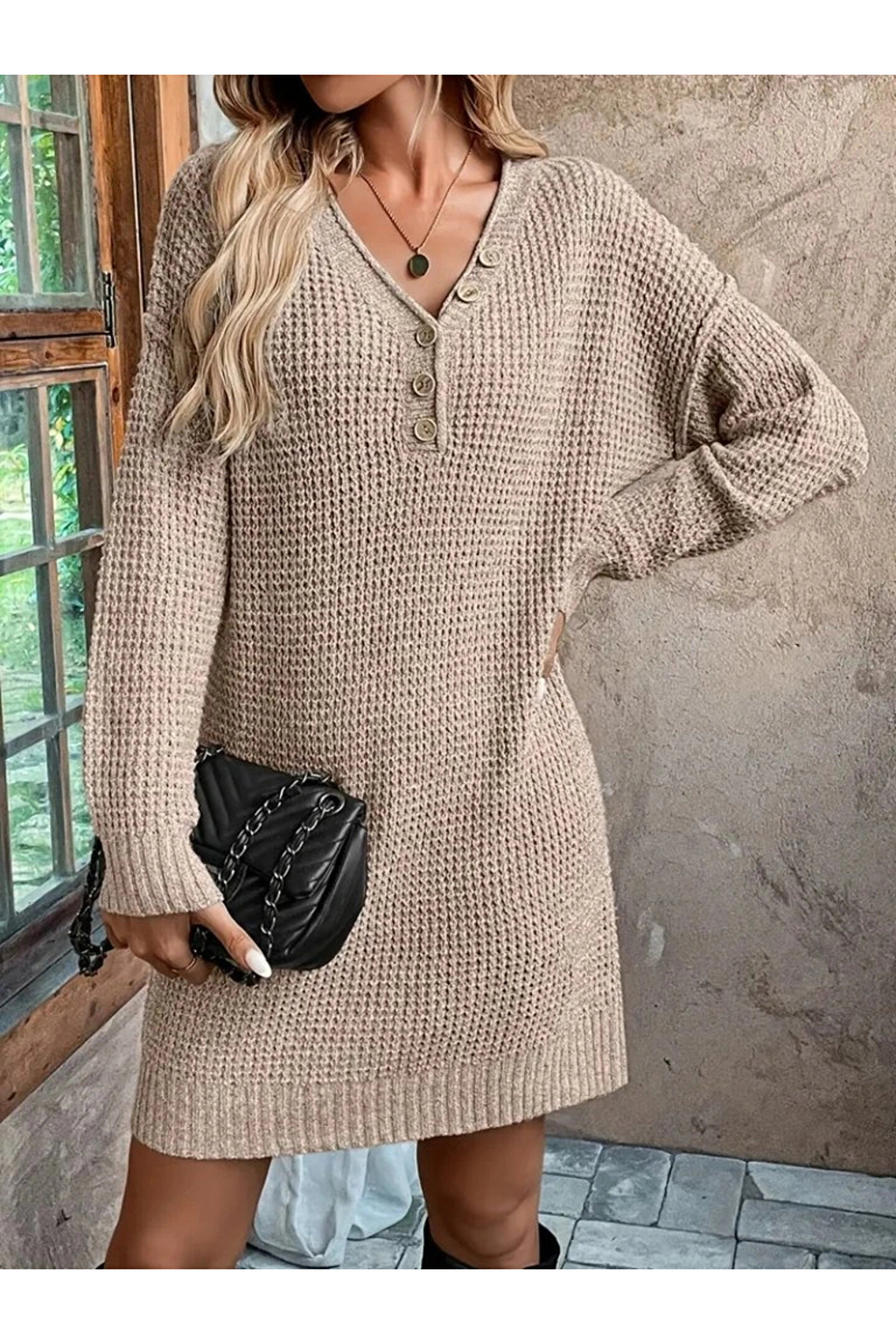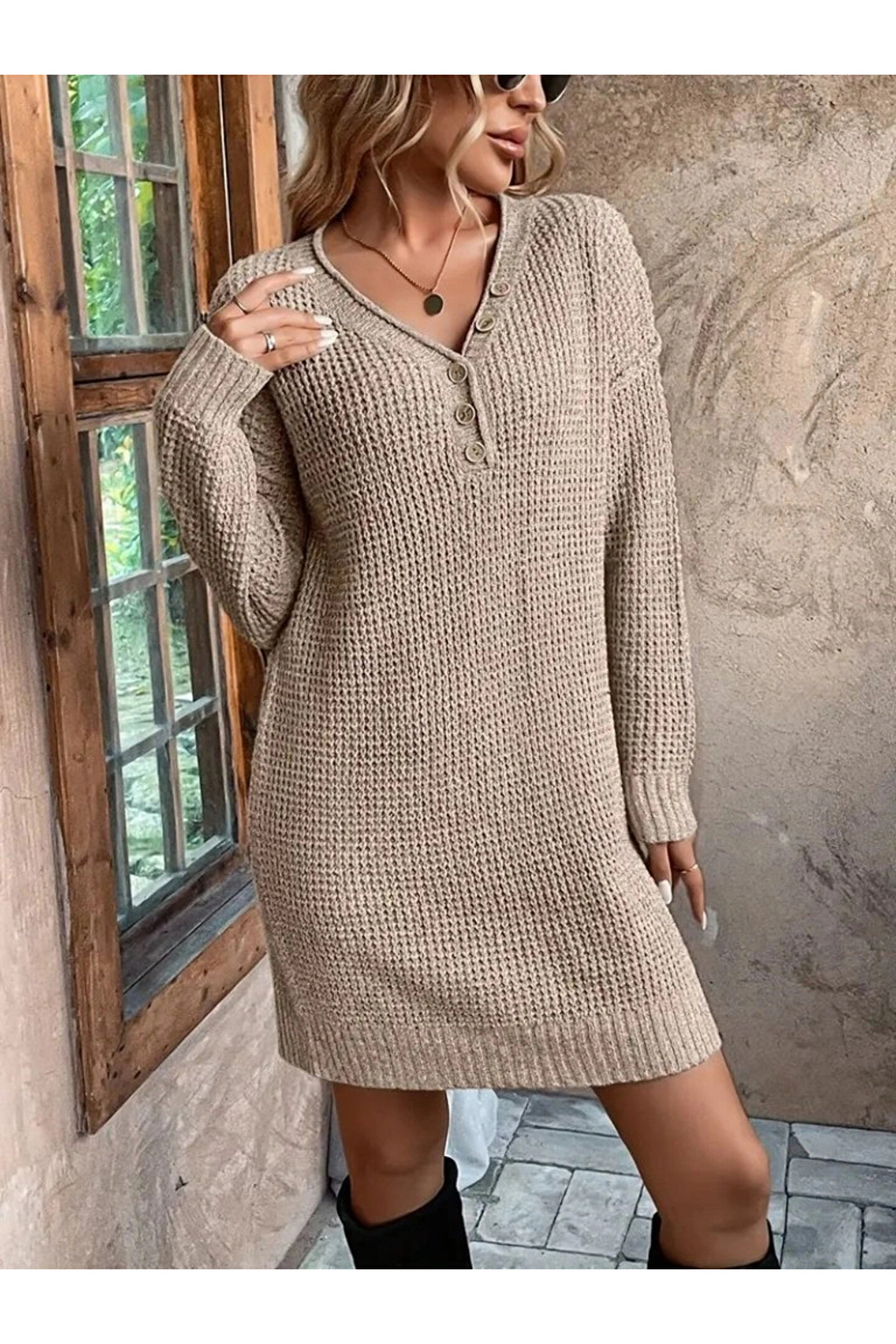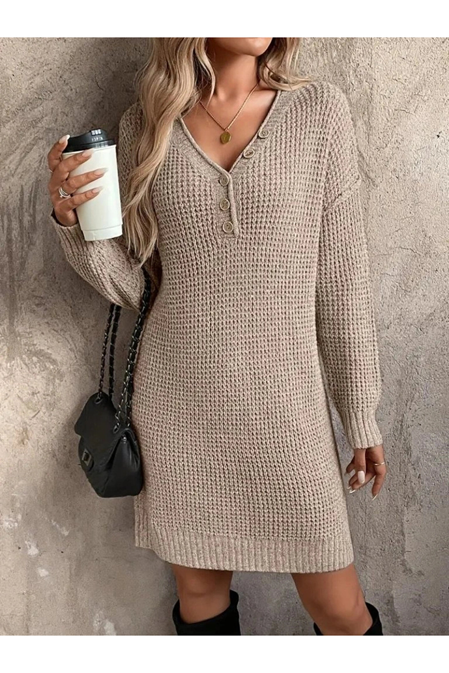 Kadın Uzun Kollu V Yakalı Düğmeli Mini Triko Taş Renkli Elbise