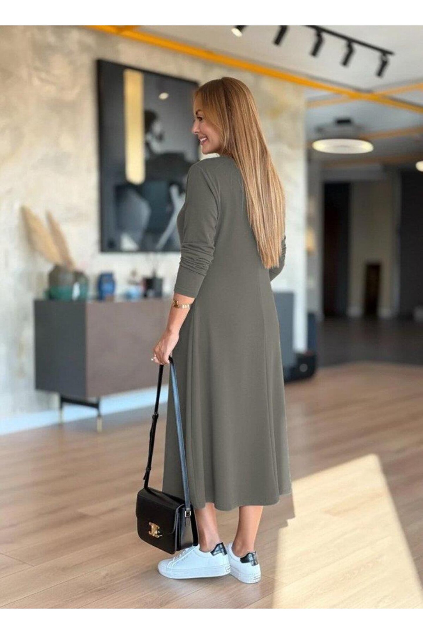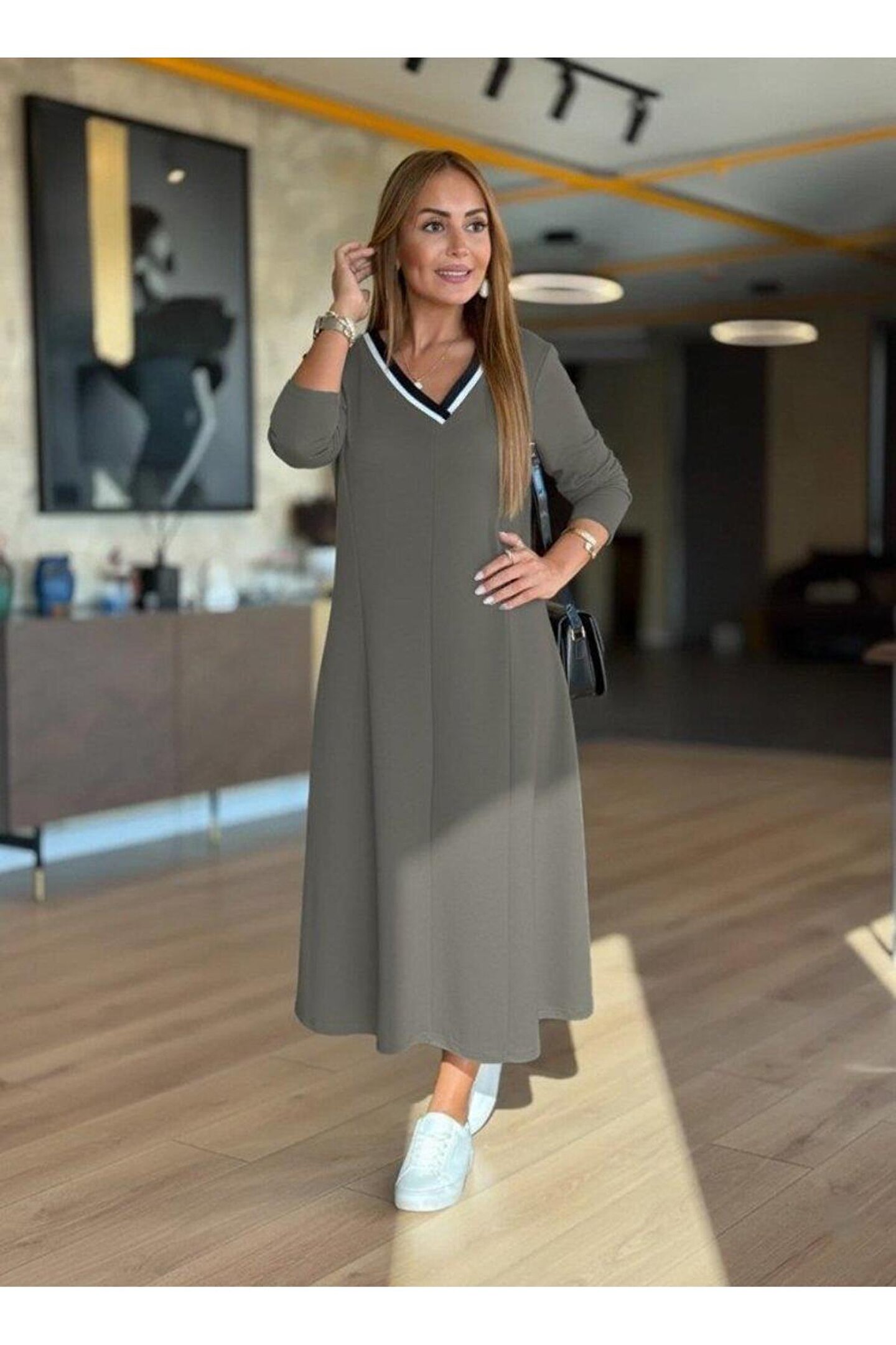 Kadın Uzun Kollu V Yakalı Midi çağla Yeşili Modal Elbise