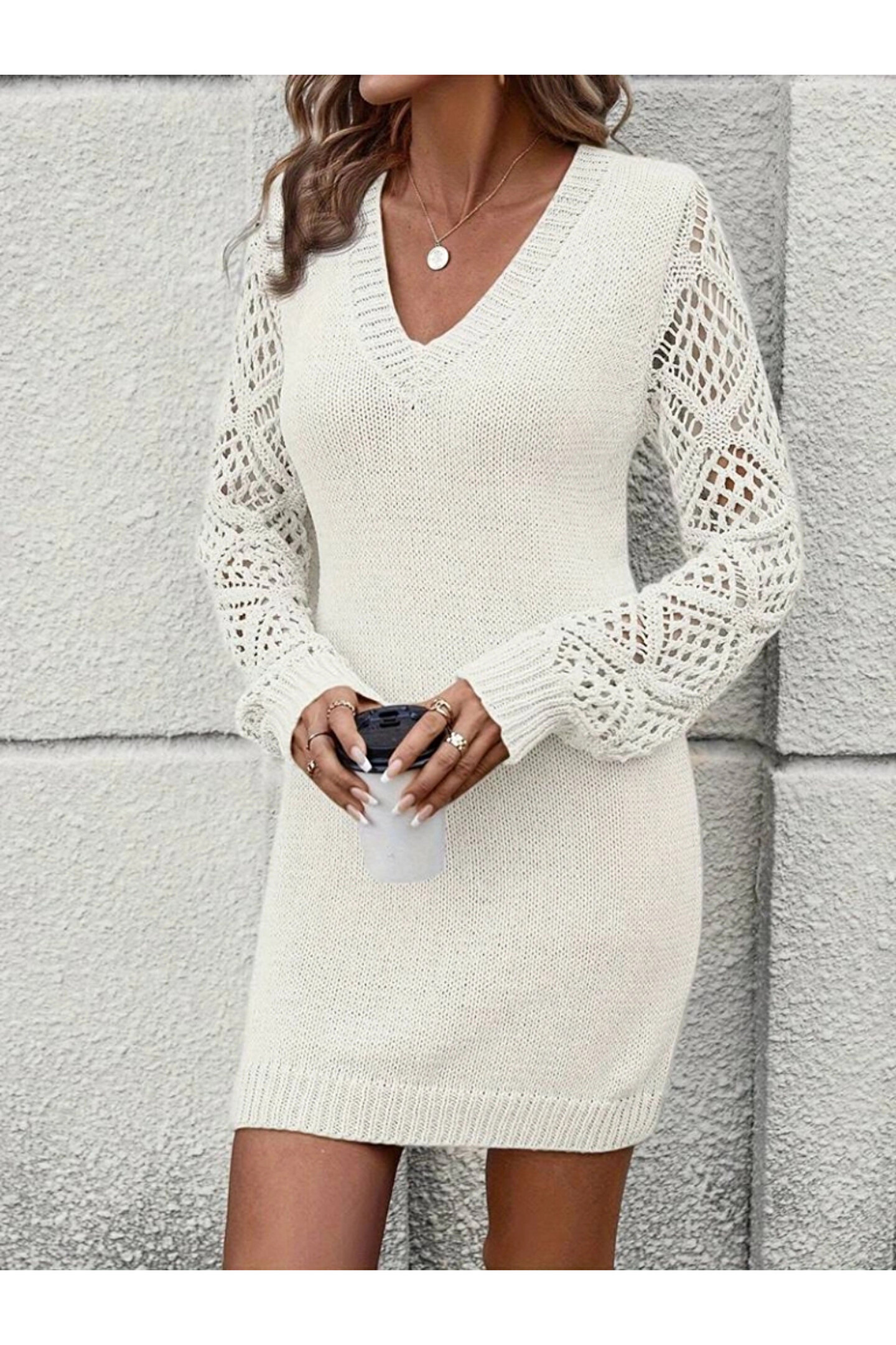 Kadın Uzun Kollu V Yakalı Mini Triko Elbise