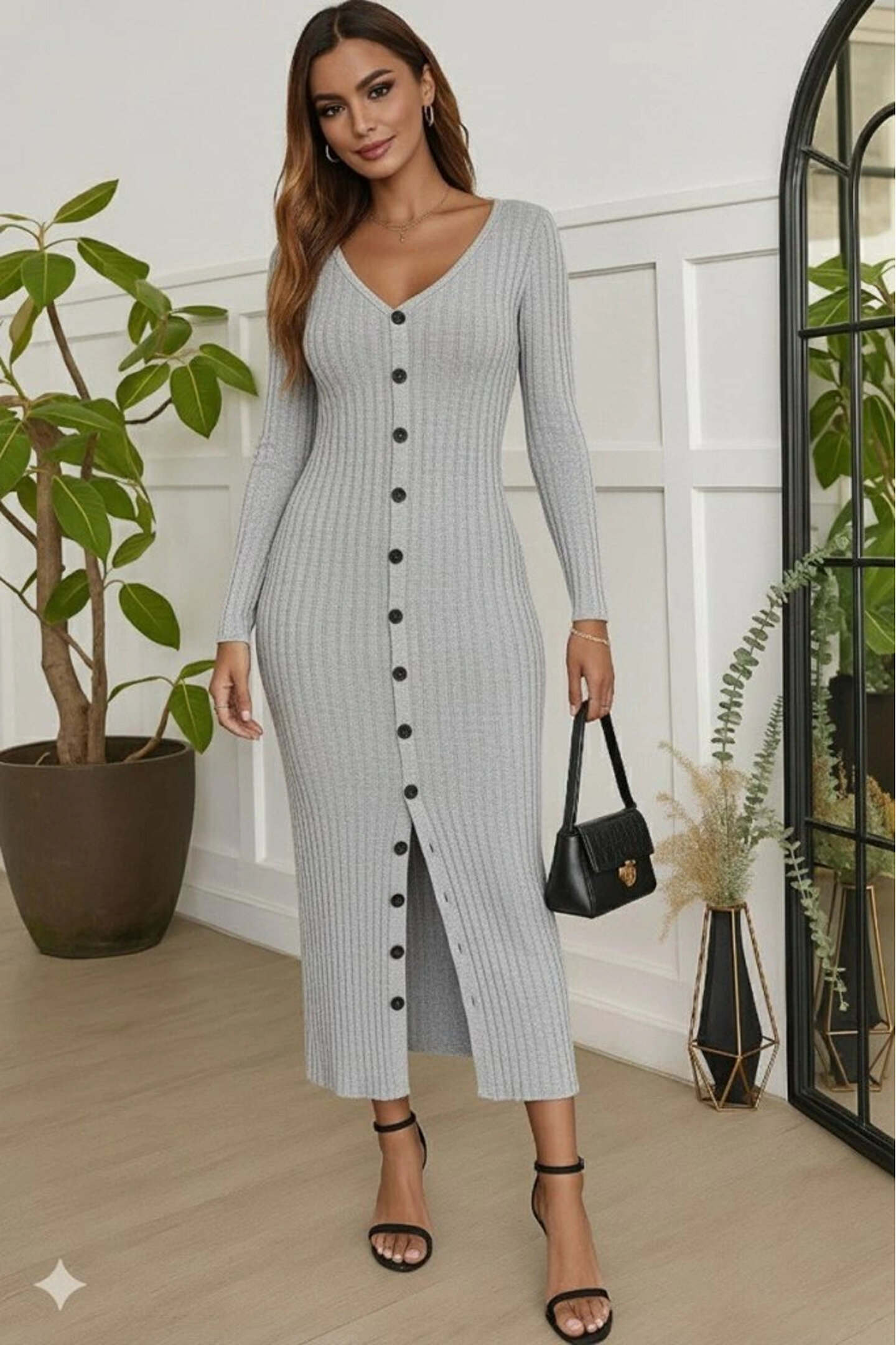 Kadın Uzun Kollu V Yakalı önden Düğmeli şardonlu Kaşkorse Elbise