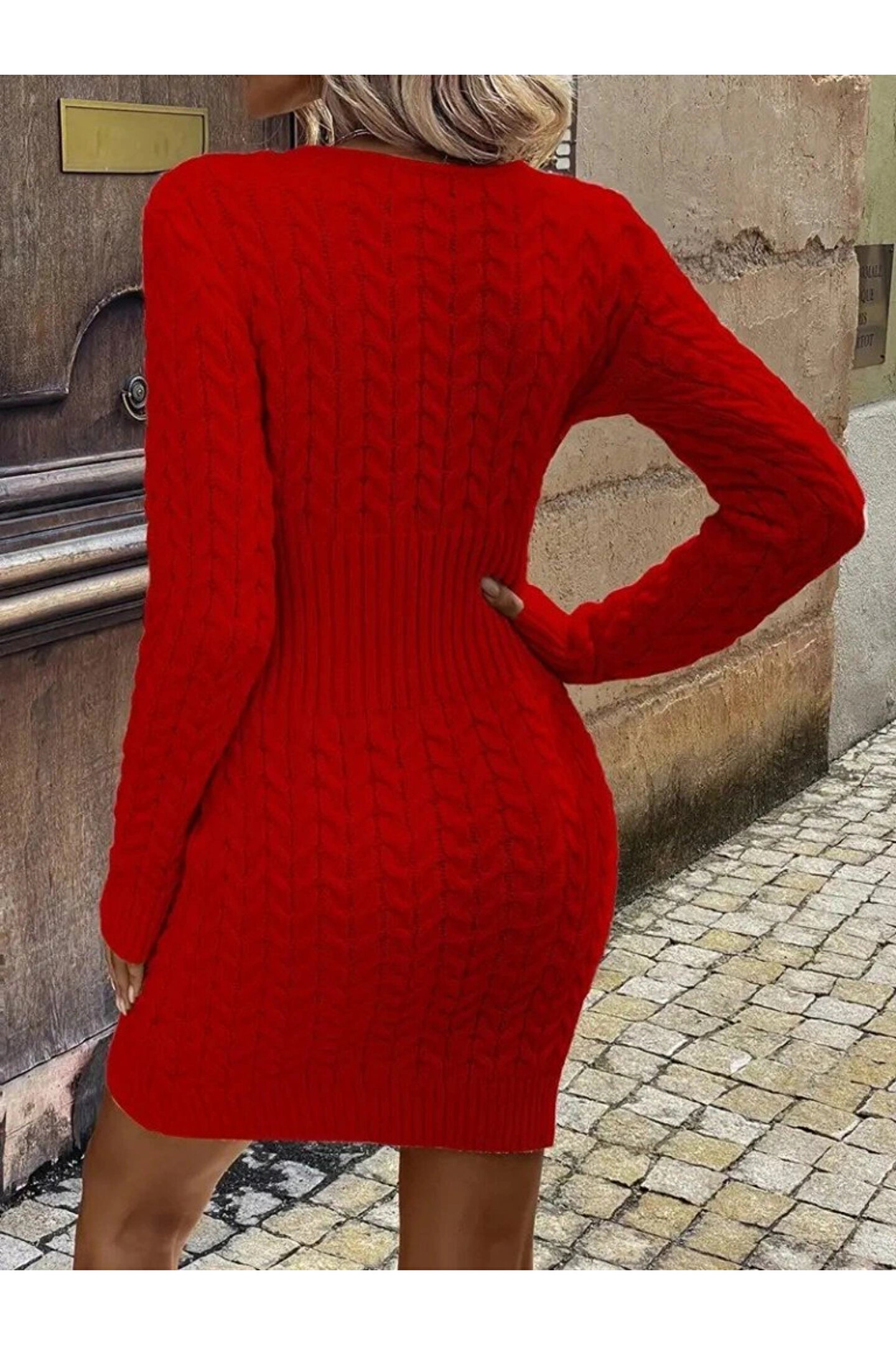 Kadın Uzun Kollu V Yakalı önden Fermuarlı Kısa Triko Elbise
