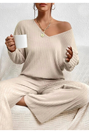 Kadın Uzun Kollu V Yakalı şardonlu Kaşkorse Bluz Ve Pantolon Ikili Takım
