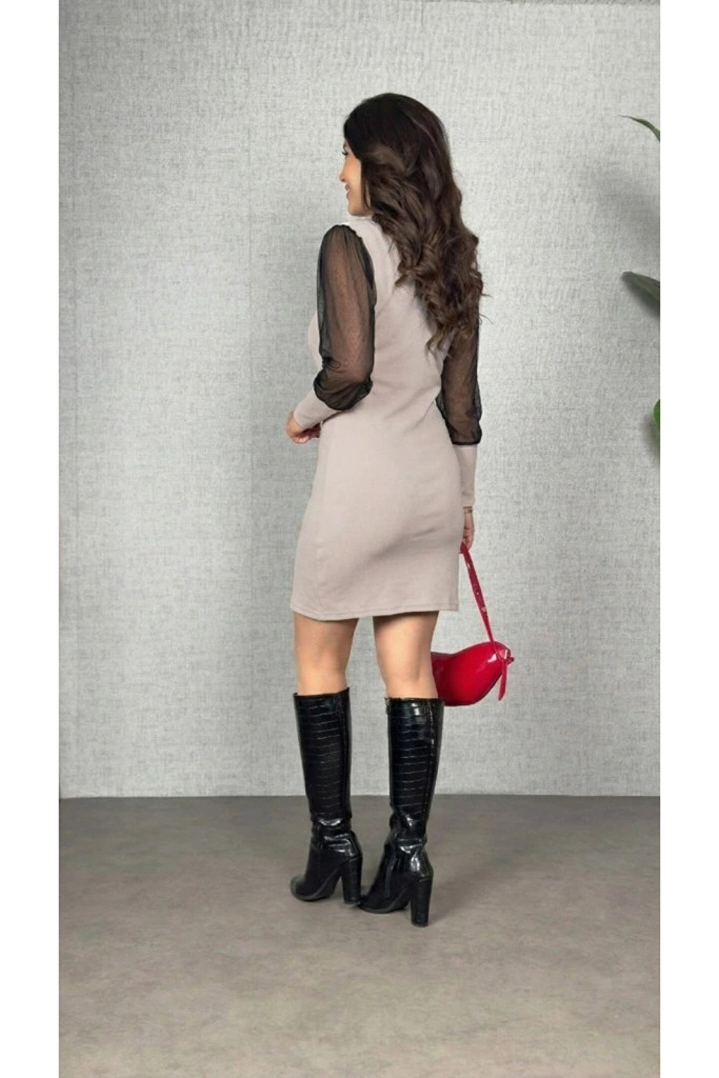 Kadın Uzun Kollu V Yakalı Tül Detaylı Mini Kaşkorse Elbise