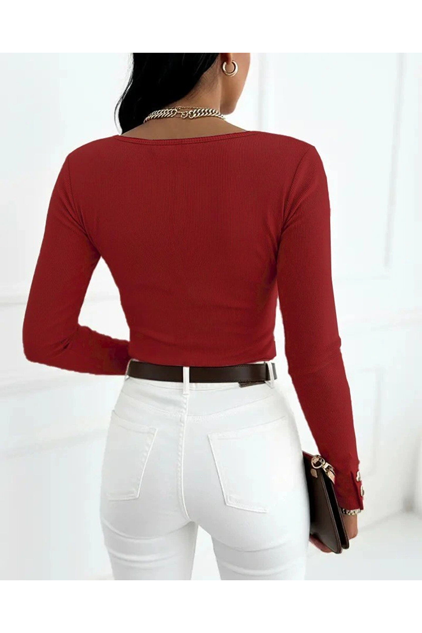 Kadın Uzun Kollu Yakadan Açık Ve Düğme Detaylı Kaşkorse Bluz